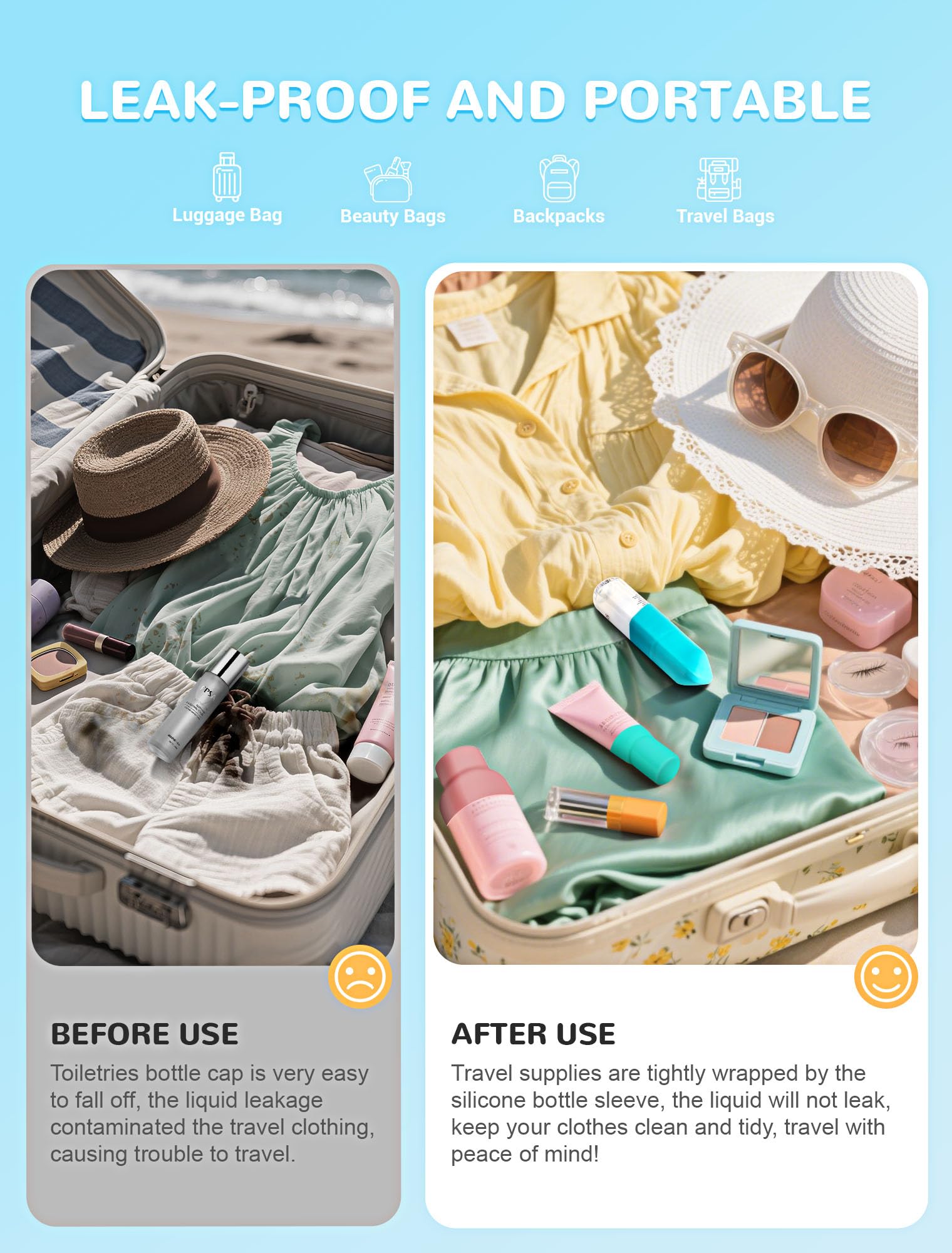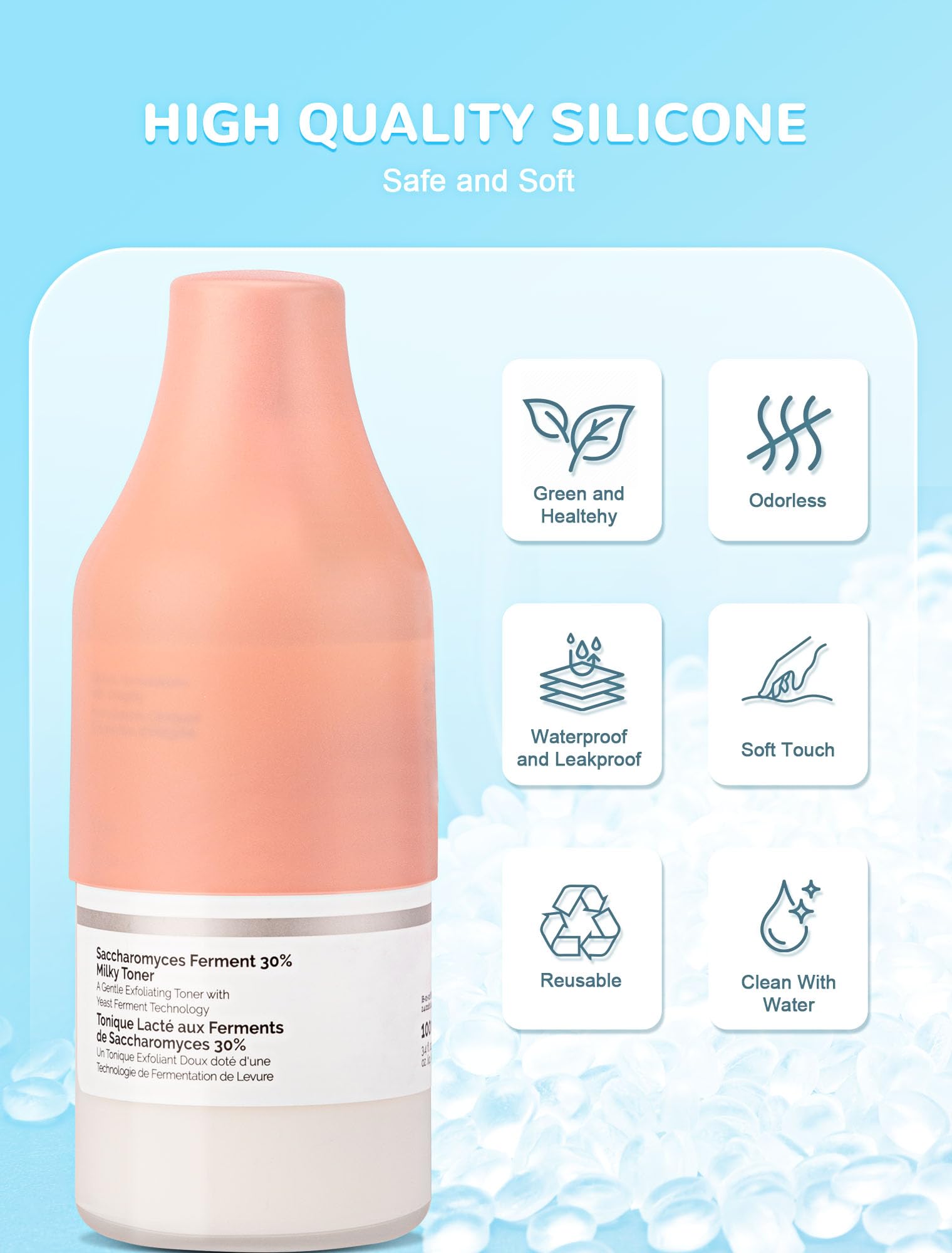- Durable & Reusable: Just slip the silicone covers onto your bottles – they grip tightly for a perfect leak-proof seal every time. Built to last trip after trip, they bounce right back to shape after use. Cleanup is a breeze: simply rinse under water and they're ready to go again!