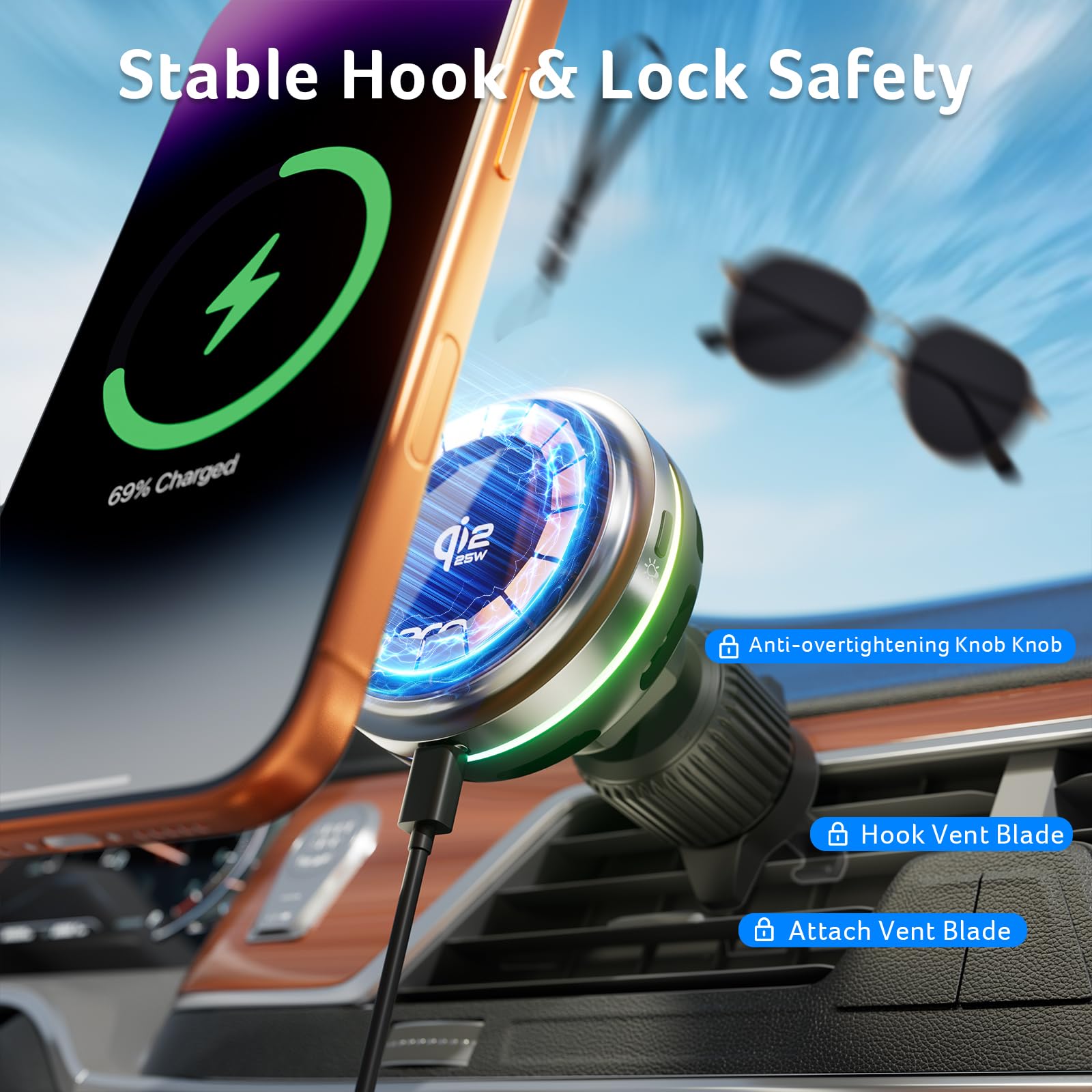 acer Qi2.2 25W Mag-Safe Car Mount Charger, Wireless Car Charger with Cooling Fan, Glass Panel & Backlight,Vent Phone Mount with 45W…