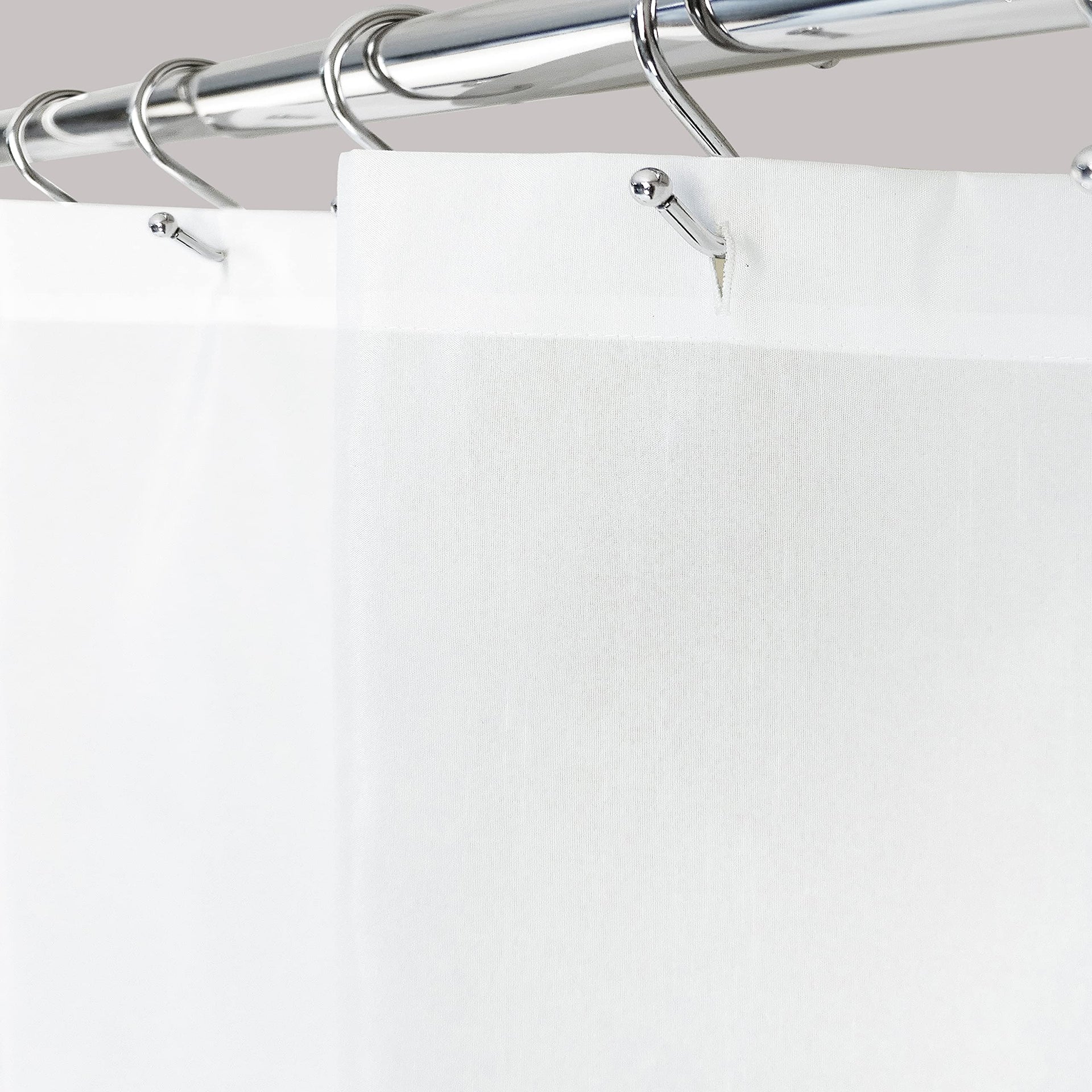 • Reinforced header with 12 buttonhole openings fits standard shower hooks (not included)