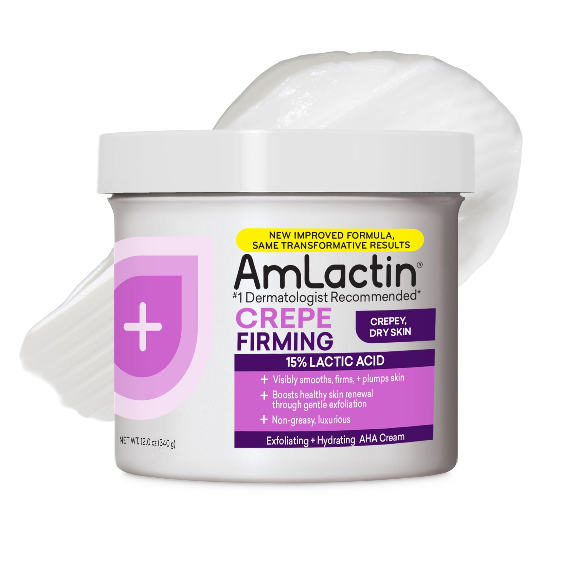 - Our formula: AmLactin’s crepe skin firming cream uses 15% lactic acid, a gentle yet effective AHA, to exfoliate dead skin cells and promote skin cell turnover; ceramides retain moisture and support the skin barrier to restore natural radiance