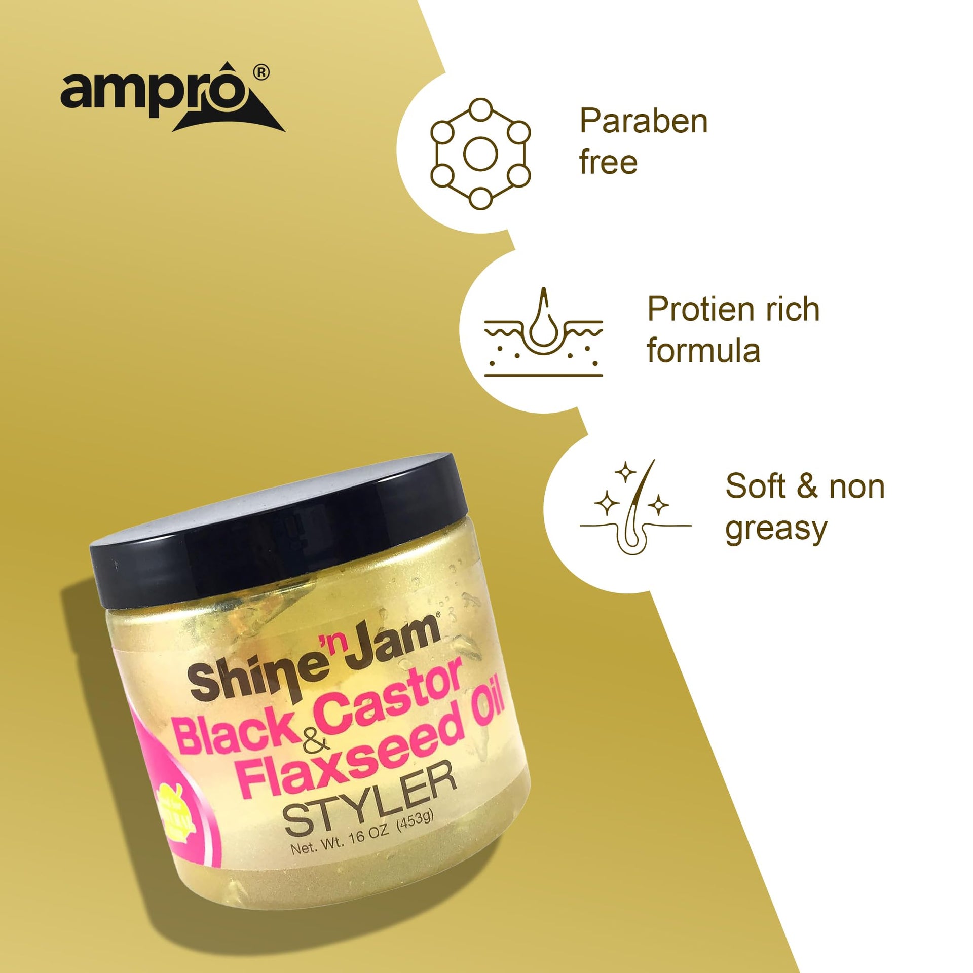 Shine-n-Jam Castor Oil and Flaxseed Gel contains keratin protein and Omega 3, 6, and 9, providing strength to all hair textures and a firm hold for natural styling versatility. Castor and Flaxseed oil fortifies your hair and adds shine with great manageability.