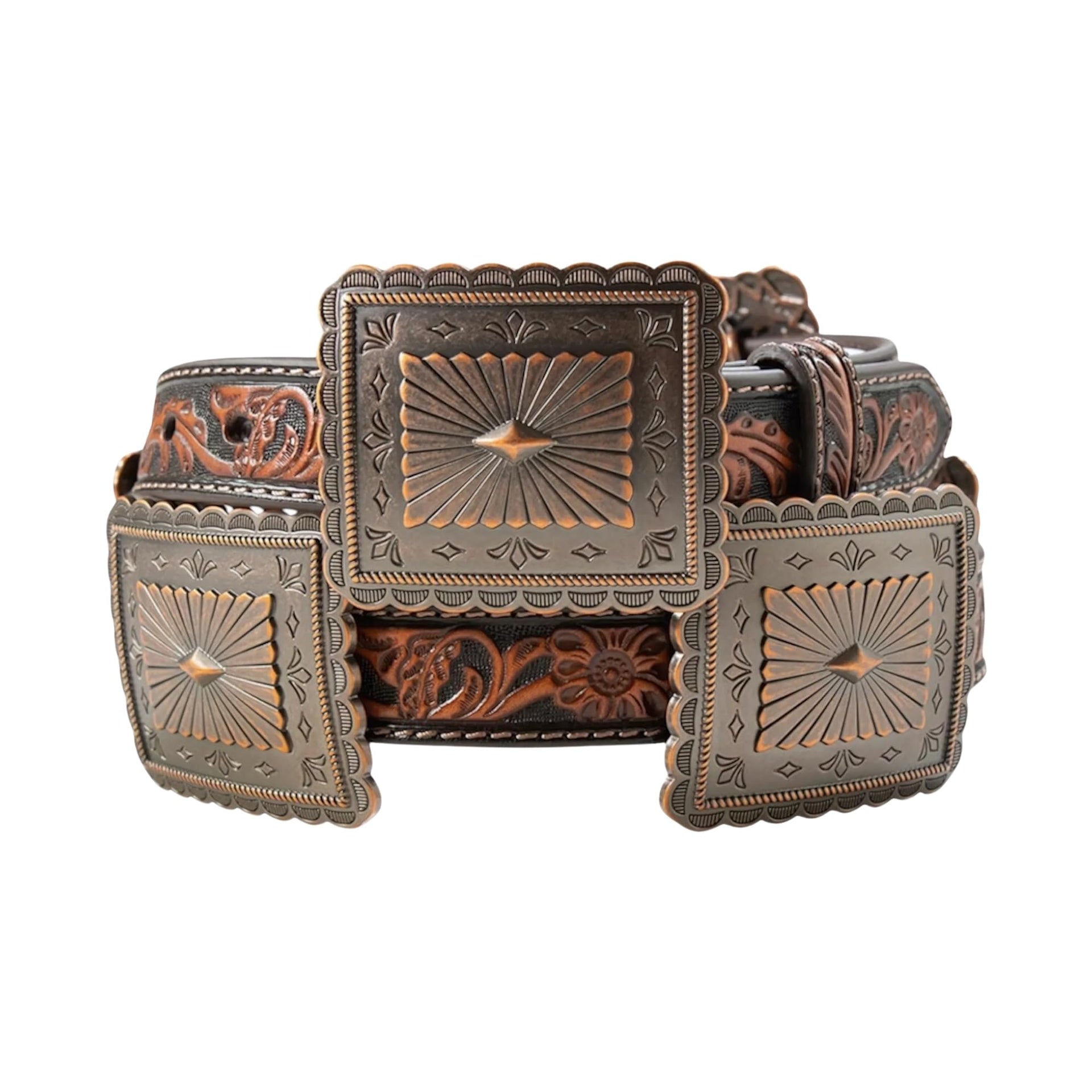 Designed for the woman who embodies Western elegance, the ARIAT Women's Floral Embossed Scalloped Concho Leather Belt is a striking blend of tradition and craftsmanship. The rich brown genuine leather strap is intricately embossed with floral detailing, creating a timeless look that pairs effortlessly with jeans, skirts, and dresses. Bold 2-3/4 inch antique copper scalloped conchos make a statement, adding a touch of rustic charm with a refined edge. Whether you're at a rodeo, out on the ranch, or dressing up for a country concert, this belt is the perfect finishing touch to your Western wardrobe.