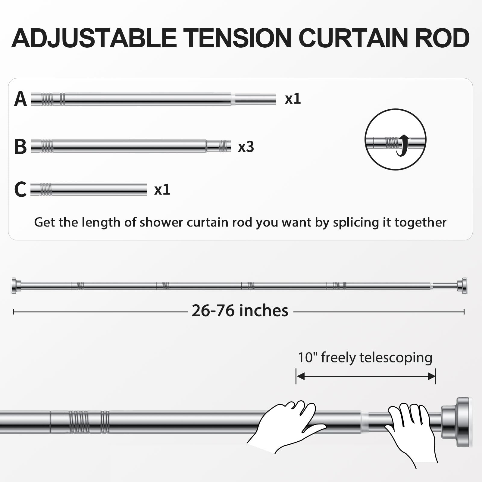 Ausemku Shower Curtain Rod, 26-76 Inch Adjustable Stainless Steel Tension Rod, Rustproof & Non-Slip, No-Drill for Bathroom & Kitchen, Silver
