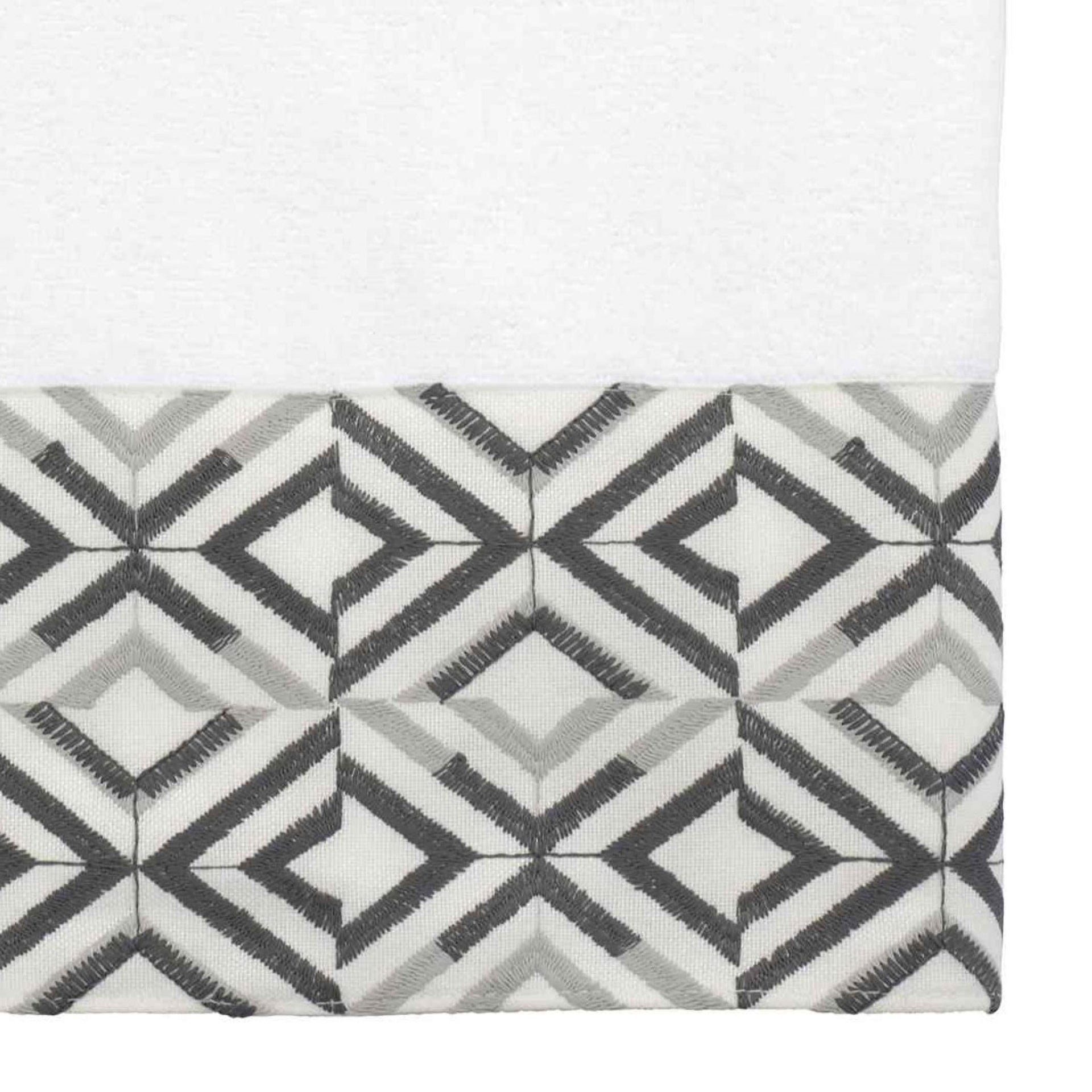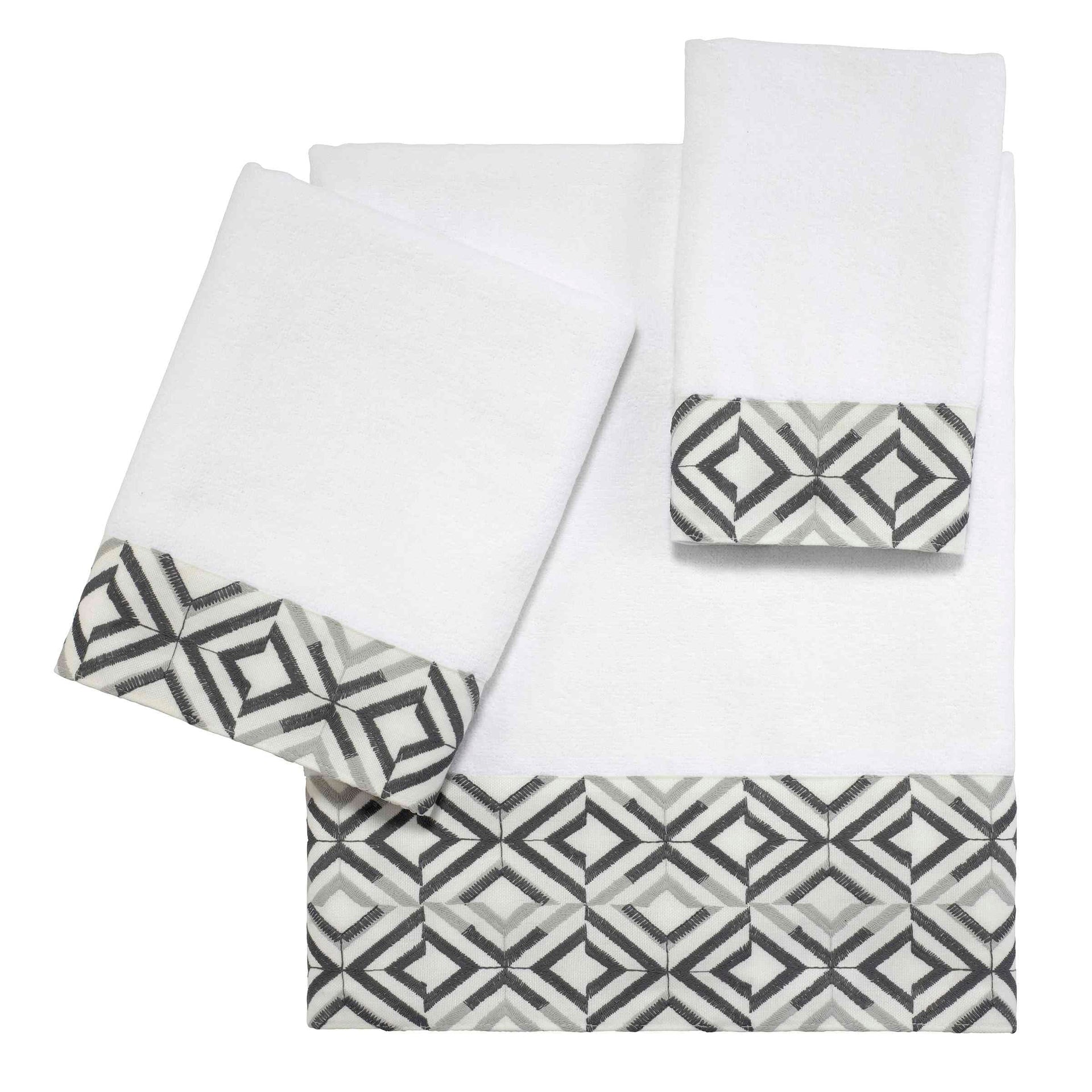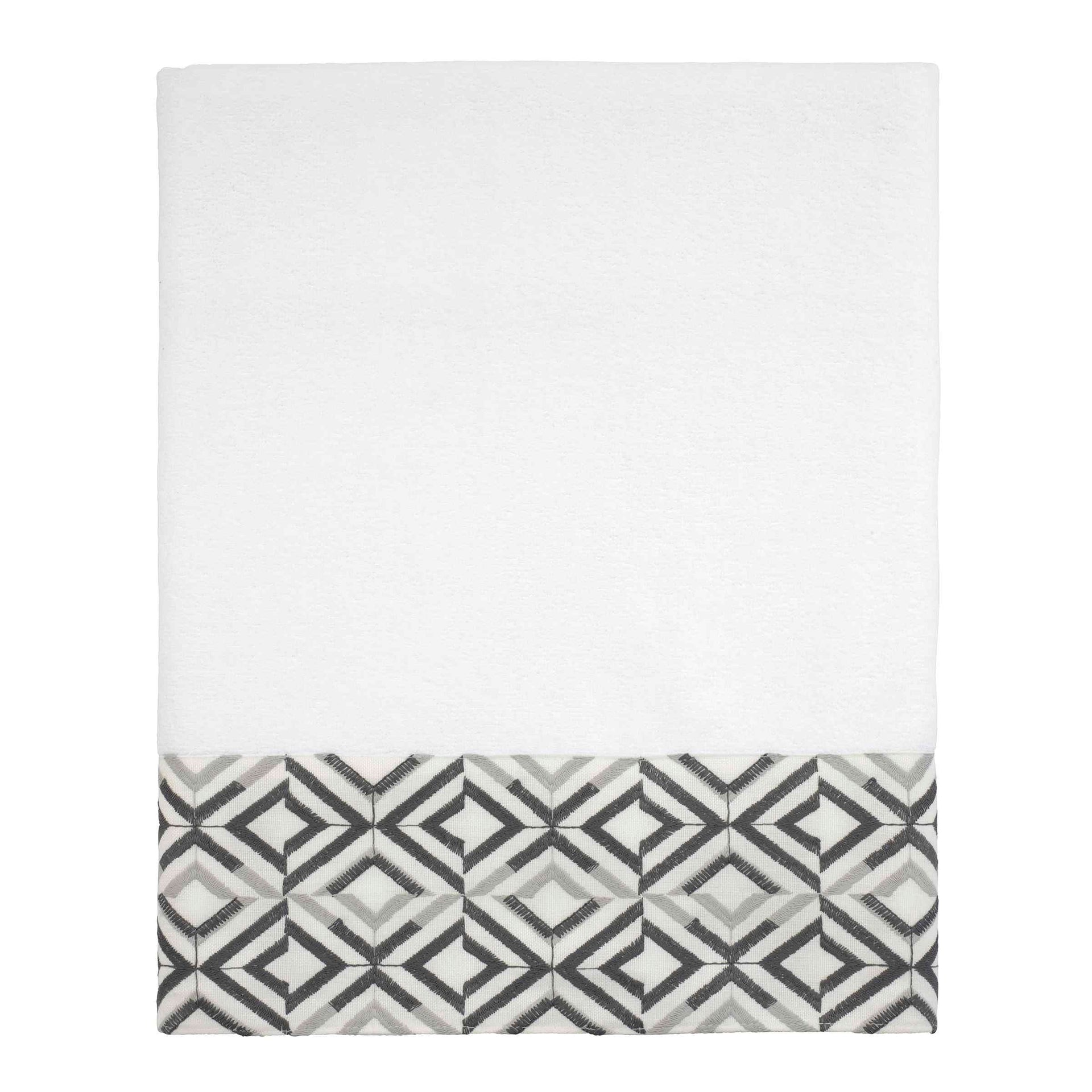The Avanti Harlow White Bath Towel features offset rows of concentric diamonds intricately embroidered in light and dark grey on a 100% polyester white cloth. The white towel is sheared for a silky, smooth, shimmering ground, the perfect complement to this contemporary design. Towel measures 27" x 50".