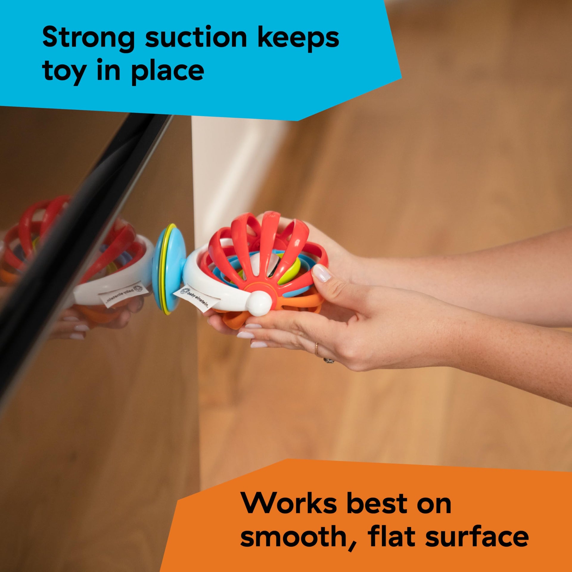 From mealtime to travel time, your baby will be utterly captivated by Baby Einstein's Sticky Spinner toy. As this table toy spins and swirls, the brightly colored loops will whip up a visually stimulating experience. See baby focus as he curiously watches the inner-ball and loops spin in opposite directions. Those colorful bands are fun to grab and spin, which will help encourage hand-eye coordination and fine motor skills. The powerful suction cup base keeps the spinner in place whenever you need to entertain your squirmy baby. Use it as a high chair toy, or toss it in the diaper bag to have frustration-free play on hand. Your baby's fascinated little fingers will keep this world of color going round and round!