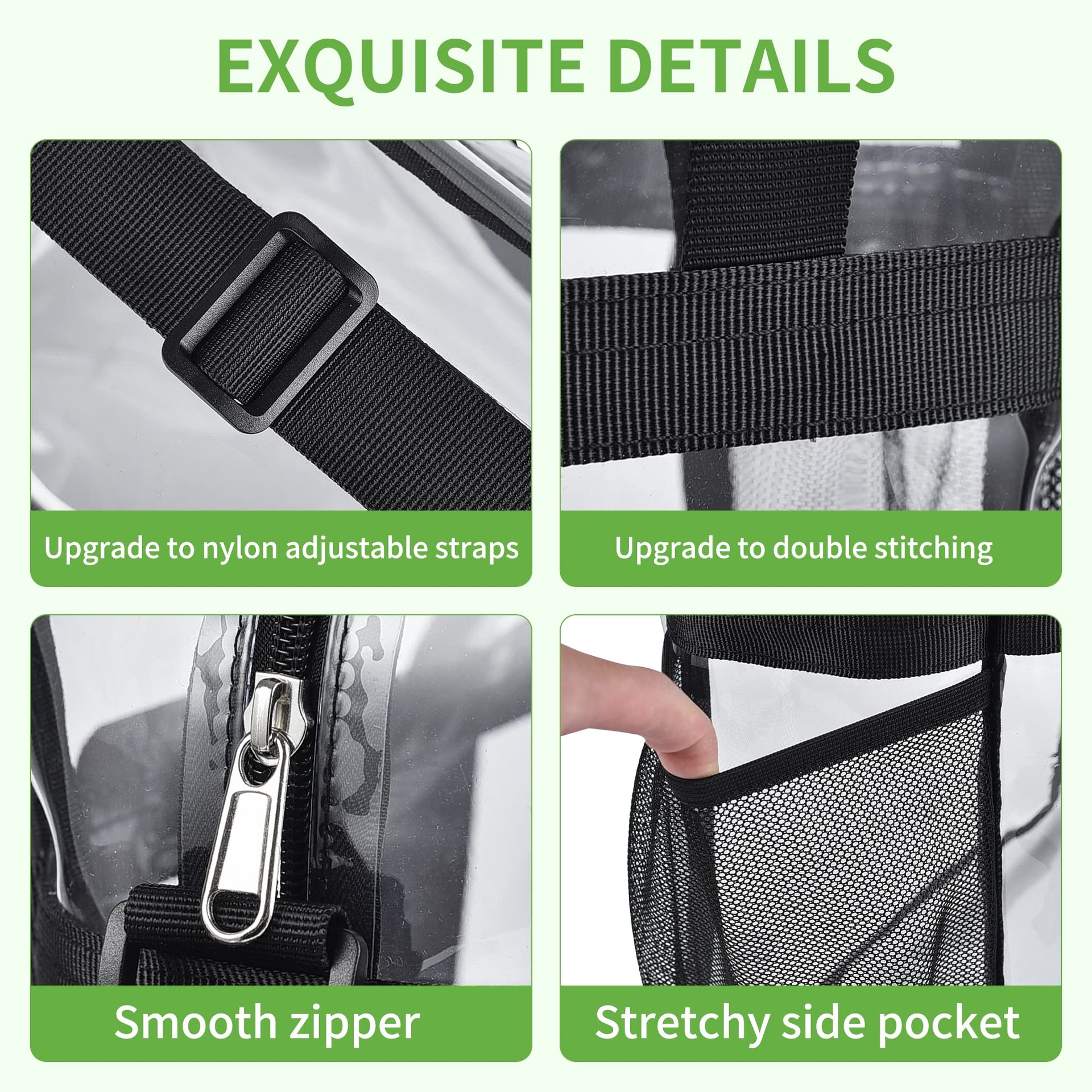 - 【 Game Day Essentials within Reach】The clear bag for stadium events has a main compartment(12"x 5.5"x12"). Big enough for carry-on items like cellphone or camera. Front pocket (7.5"x6.5") holds sunscreen, hand sanitizer, tickets & earplugs! Mesh sides secure water bottles/umbrellas.