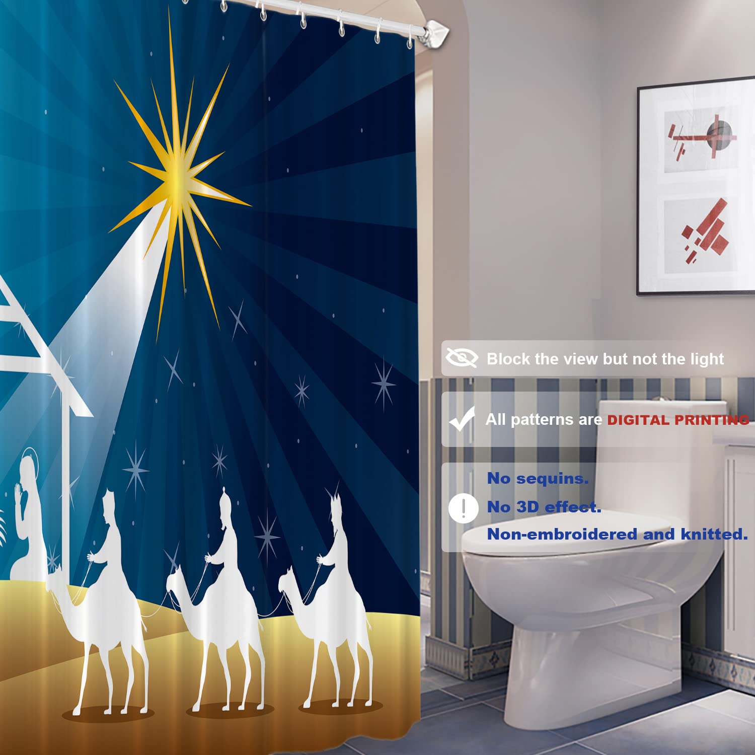Batmerry Night Christmas Star Decorative Shower Curtain - Bethlehem Scene With Wise Men, Bible Theme - Long Wide Waterproof Washable for Bathroom