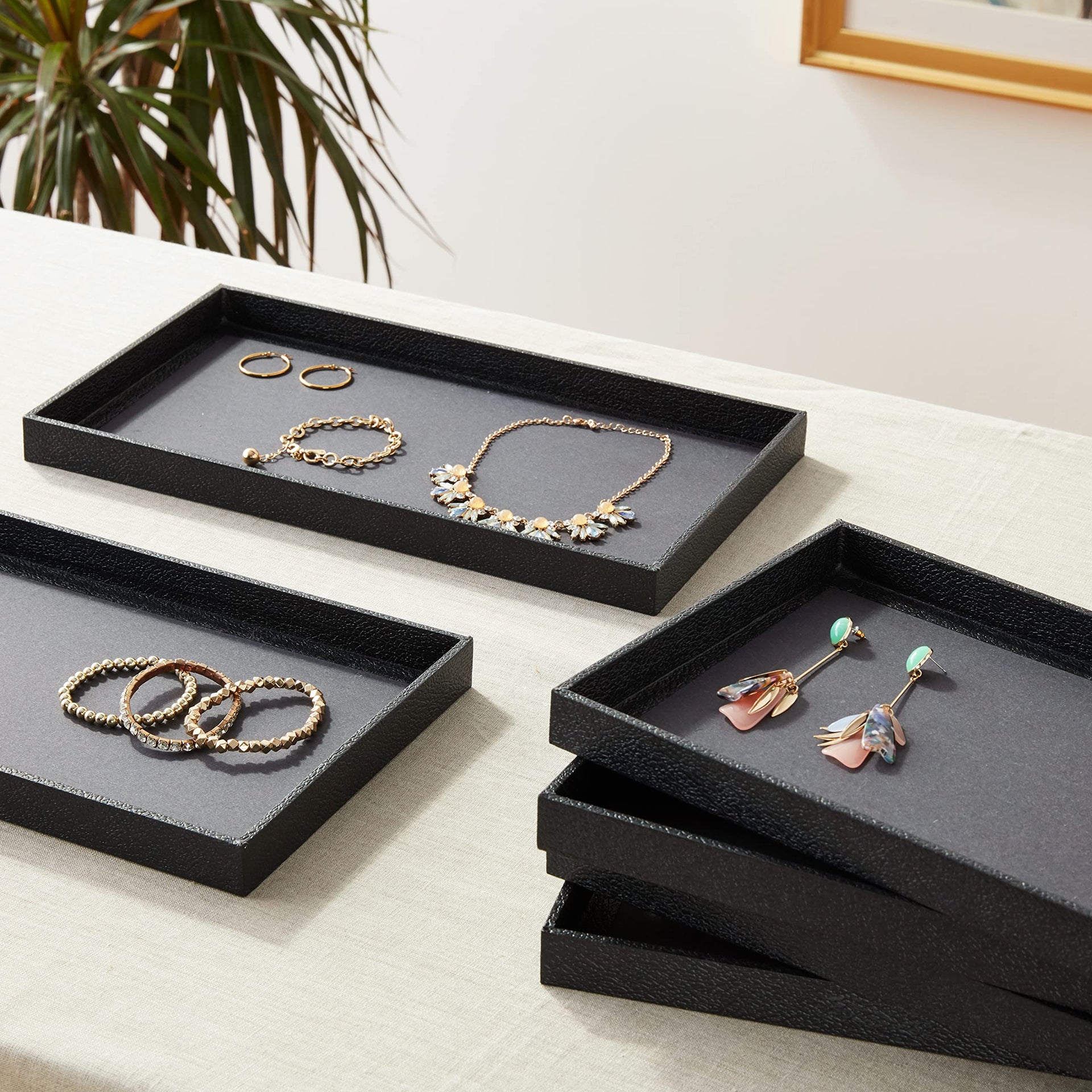 A great way to display your jewelry, or other small and precious merchandise. Six sturdy faux leather and wood trays take standard size inserts (inserts not included). Standard size, approximately 14 3/4 Inch long and 8 1/4 Inch wide. 1 Inch High.