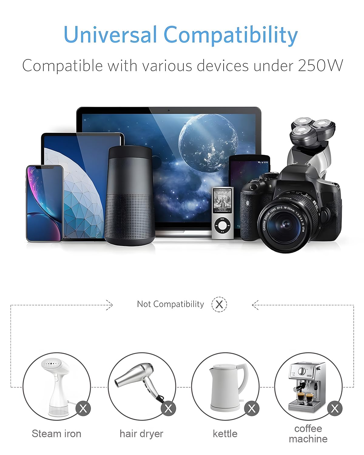 - Maximum Wattage: 250W(When simultaneously charging multiple devices,make sure the total wattage is less than 250 watts.) Do not use this power converter to charge your hair dryer regardless of their wattage.