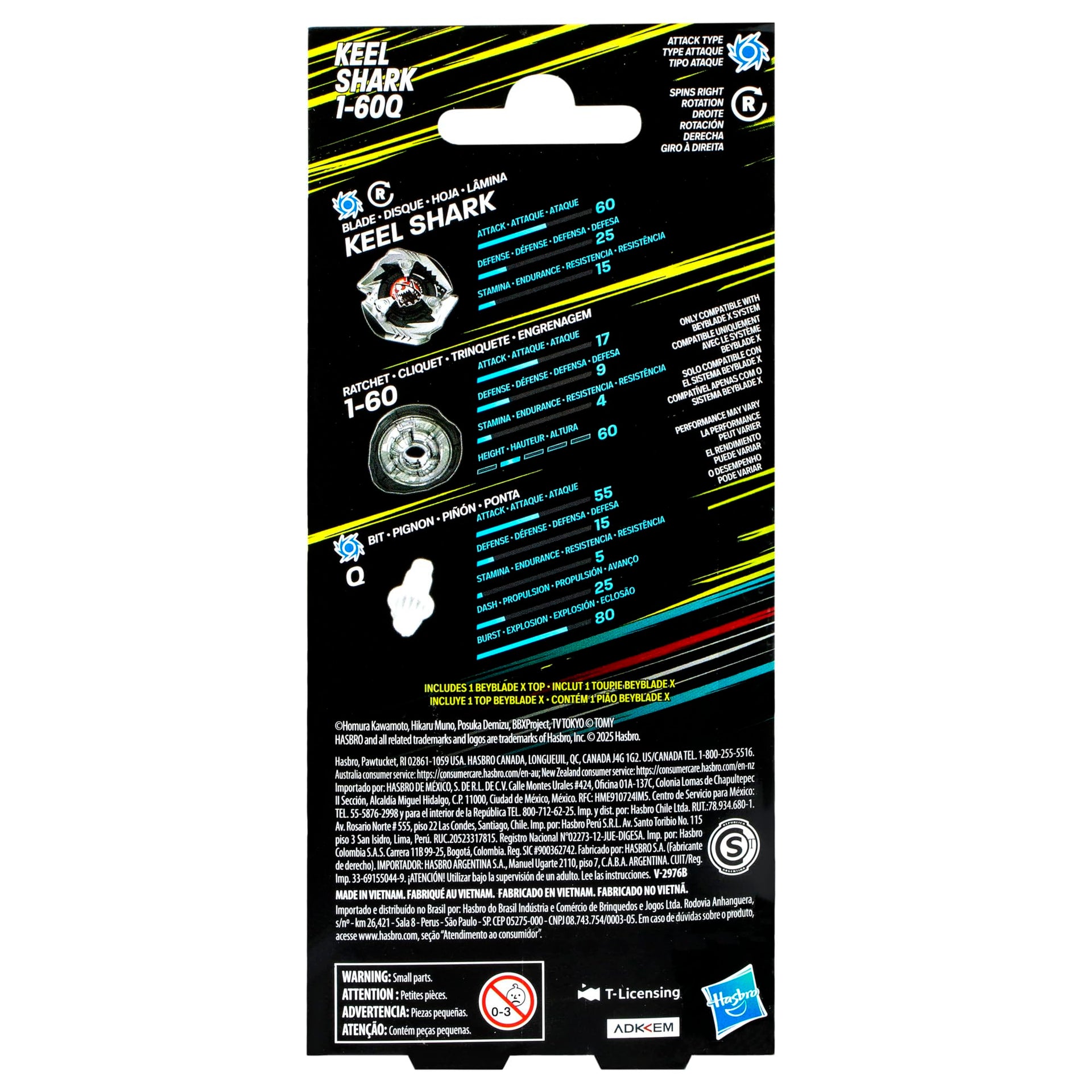 Experience the thrill of the next generation of Beyblade stadiums, launchers and tops: Beyblade X with the Beyblade X Keel Shark 1-60Q Booster Pack Set which includes 1 right-spinning Attack Type top (Beystadium and launcher required, sold separately). Launch right into battle or reconfigure the interchangeable blade, ratchet, and bit of this Booster Pack with those of other Beyblade X tops (sold separately) to create your own unsurpassable top. Beyblade X features the X-Celerator Gear System innovation to level-up your game. When the gear of a Beyblade X top engages the rail of the Beystadium arena, it can super-accelerate into an Xtreme Dash rocketing it around the stadium for crushing collisions and epic bursts. Bladers launch their tops into fierce clashes against their opponent’s scoring points with each confrontation - first to score 4 points wins. Hasbro Beyblade toys with authentic Takara Tomy die-cast metal tops make great kids gifts for boys and girls ages 8 and up. HASBRO and all related trademarks and logos are trademarks of Hasbro, Inc.