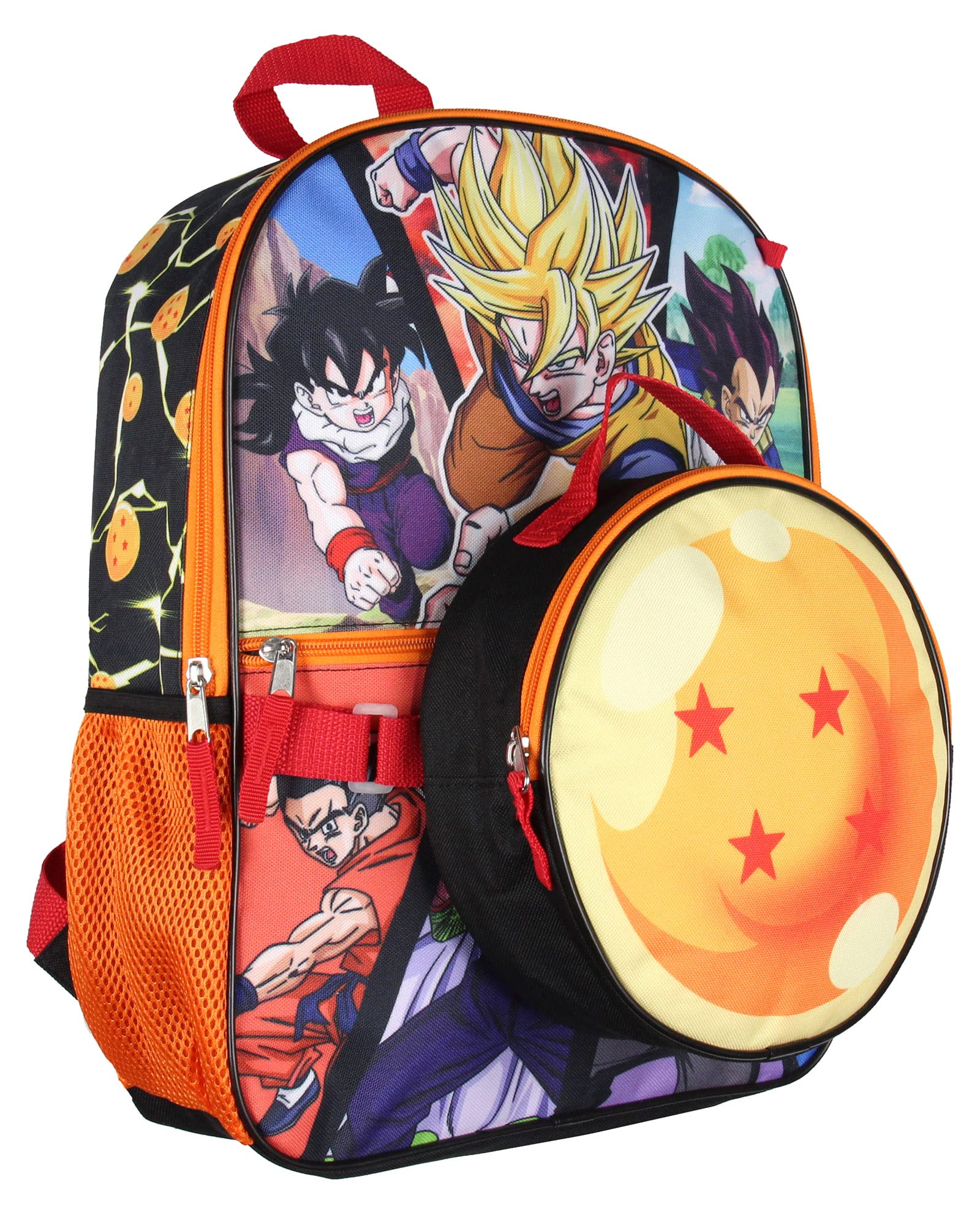 "Dragon Ball Z" follows the adventures of Goku, who, along with the Z Warriors, defends the Earth against evil. Join Goku with this character backpack! The Dragon Ball Z backpack features several characters from the series, such as Goku, Vegeta, Piccolo, Trunks, Krillin, and more! The lunchbox is designed to look like one of the Dragon Balls from the anime and manga. The backpack has two main pockets along with two mesh water bottle pockets on either side. It also comes with a pencil pouch, a drawstring sack, and a Dragon Ball keychain. Manufacturer recommended age: 3 years and older.