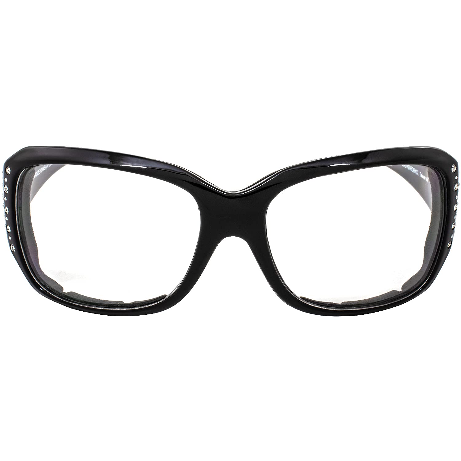 Add a little glam to your biker look when you wear our Birdz Eyewear LadyBird sports fashion sunglasses. Boasting wide square glossy black frames leveled up with shimmering rhinestones at the temples, these women's sunglasses are perfect for everything from motorcycle or ATV riding to running errands and skateboarding. Featuring vented EVA foam padding to shield your eyes from wind and debris, the larger frame and comfortable modern design gives your eyes ample coverage as well as excellent protection from the elements. Shatterproof polycarbonate lenses boast an anti-fog coating for clarity of vision in all conditions. You can wear your LadyBirds on the road or on your regular errands and even add some style to your sporting activities while getting nothing less than the best protection possible. You and your eyes deserve it! You are purchasing 1 pair of black frames with smoke lenses and 1 pair of black frame with clear lenses, perfect for day and night protection.