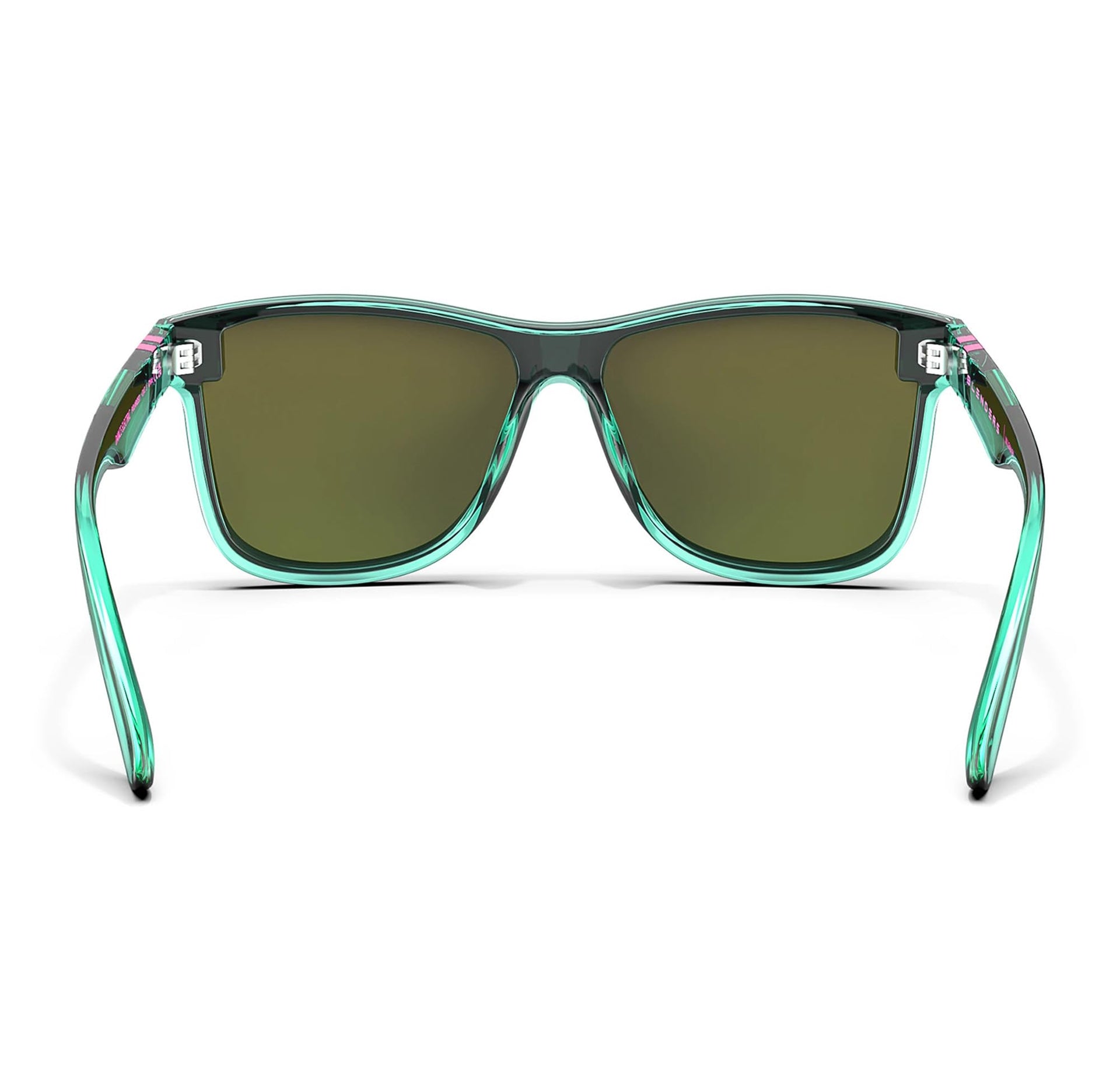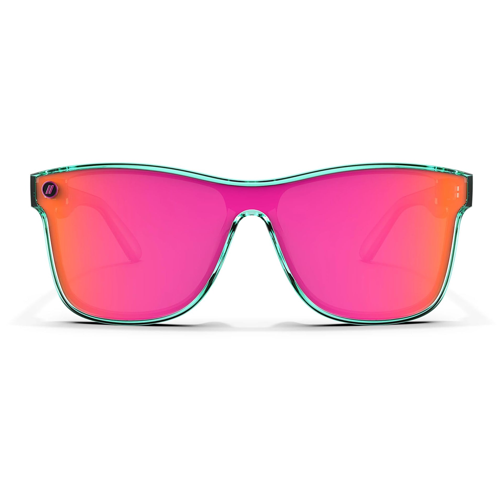 • the polarized mirrored lens is brilliant in hot pink, while the gloss crystal teal frame creates a vivid contrast