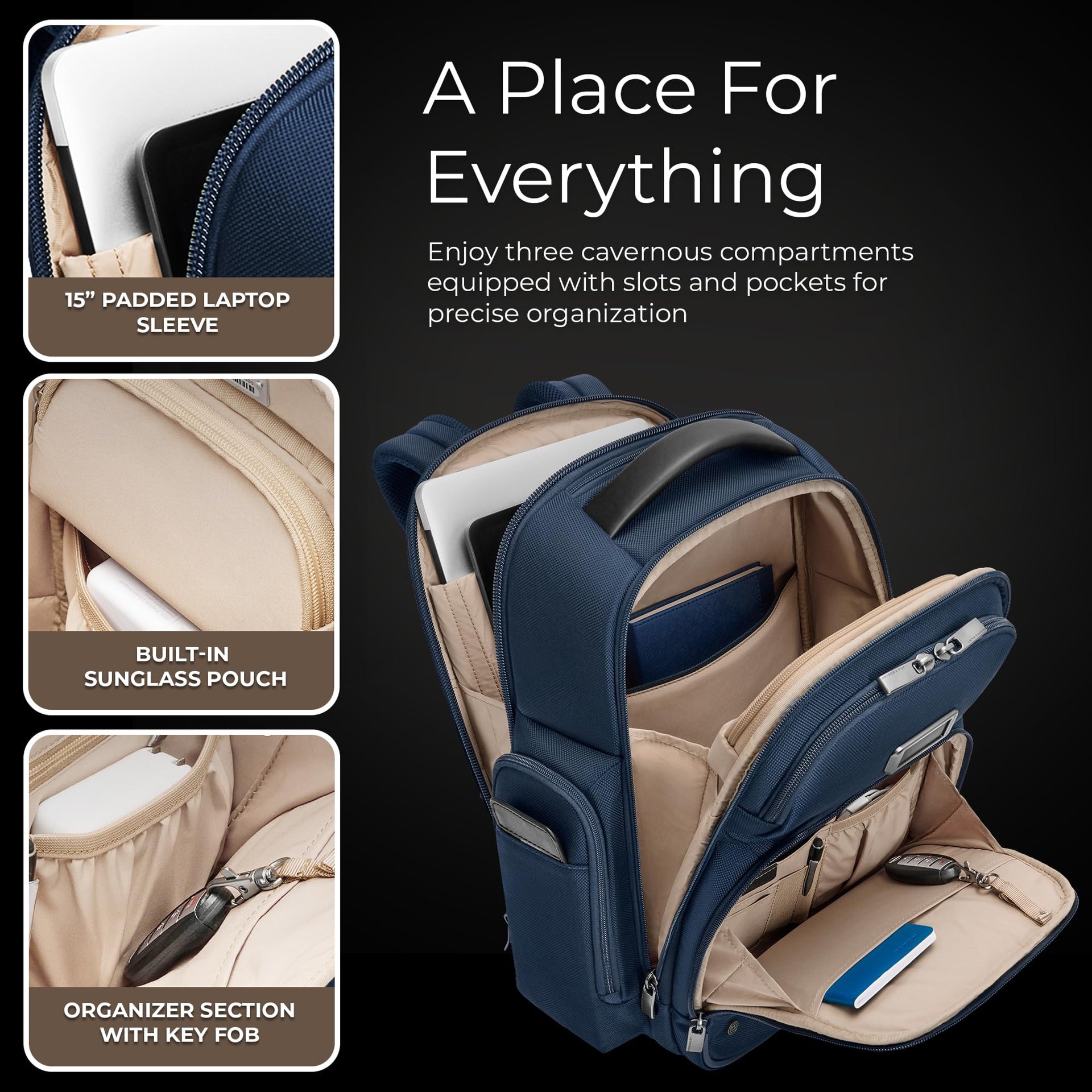 Superior materials tested to the highest standards for a product that lasts a lifetime, Elegant personalization allows you to make each piece your own, Quickly access your must-have items with a front slip pocket with a magnetic closure, Fabric lining is durable and soft in a contrasting color that makes finding contents easy, The SpeedThru pocket makes finding all your important items effortless., Discrete top pocket perfect for quickly stashing your cell phone or other accessories, Keep tabs on your bag with an pocket designed to conceal a digital tracker in the discrete top pocket, Three section design: two organizer pockets on front panel, main compartment and laptop compartment, Front pocket equipped with organization and a RFID shielding to secure your personal data, A convenient key fob found in the organizer section guarantees your keys always have a home., Top cargo pocket on front panel for additional travel accessories and two elastic pen loops, Cavernous main compartment accommodates large and bulky or odd-shaped items, like shoes or a change of clothes, Full-length slip pocket in main compartment for storing letter or legal-sized folders and files, Store your @work Tech Kit (sold separately) with a dedicated bloused pocket for a perfect fit , Securely stash your sunglasses with a built-in pouch, Tech compartment includes an integrated padded laptop sleeve protects most 15" computers and slip pocket for a tablet., Gusseted side u-zip pocket secures a water bottle, Hide-away ID tag that keeps your personal information concealed during travel, The hidden back security pocket provides incredible functionality and protection., Ingeniously designed with padded, ergonomic shoulder straps to provide complete comfort as you travel to your destination
