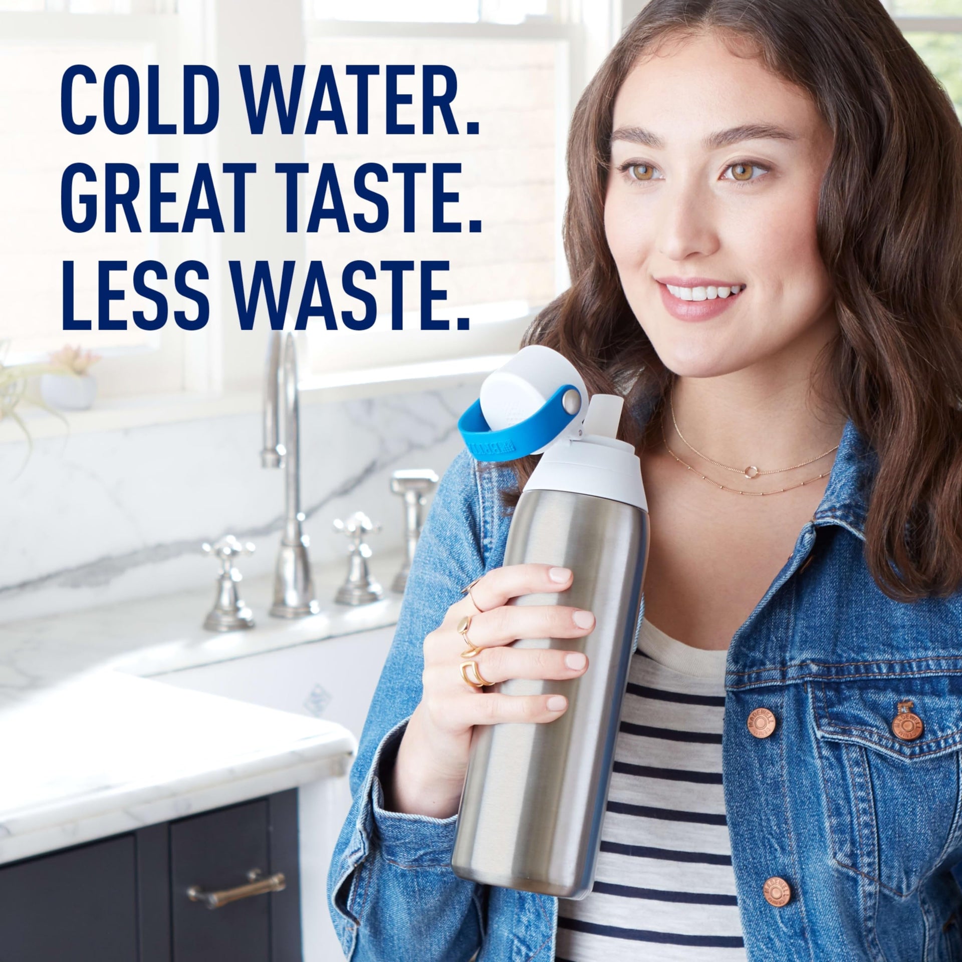 Drink healthier, great-tasting tap water with the BPA-free Brita Stainless Steel Premium Filtering Water Bottle. This durable, double-wall insulated filtered water bottle stays cold for a full 24 hours, making it fantastic for long road trips, all-day sports tournaments or office use. The Brita water filter bottle utilizes an activated carbon block filter to cut the taste and odor of chlorine and reduce particulates in water as you drink. You can also replace 300 standard 16.9-oz. single-use plastic water bottles with just one water bottle filter. It's an easy way to stay hydrated, save money and reduce plastic waste. Created for effortless convenience, this water bottle features an enclosed, easy-sip straw, a built-in carrying loop for grab-and-go portability and a one-handed push-button lid. A leakproof water bottle design helps you avoid surprise drips and spills. This water bottle is compatible with Brita water bottle replacement filters, which should be changed every 40 gallons or about every two months. Get great taste, less waste and more savings from Brita.