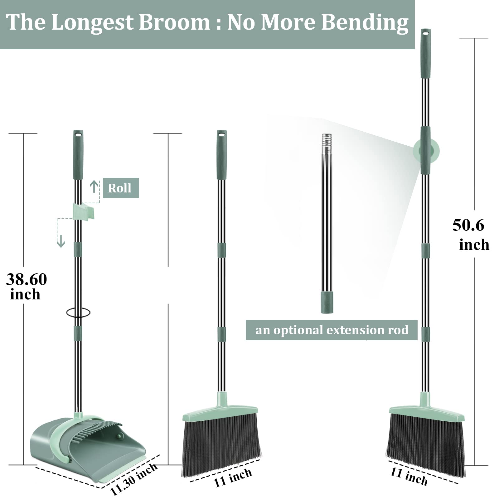- Long Adjustable Handle Broom: Optional extension pole makes the broom length from 38.6 to 50.6 inches, People can choose the appropriate broom length according to their height. The broom long handle allows you to stand upright for comfortable
