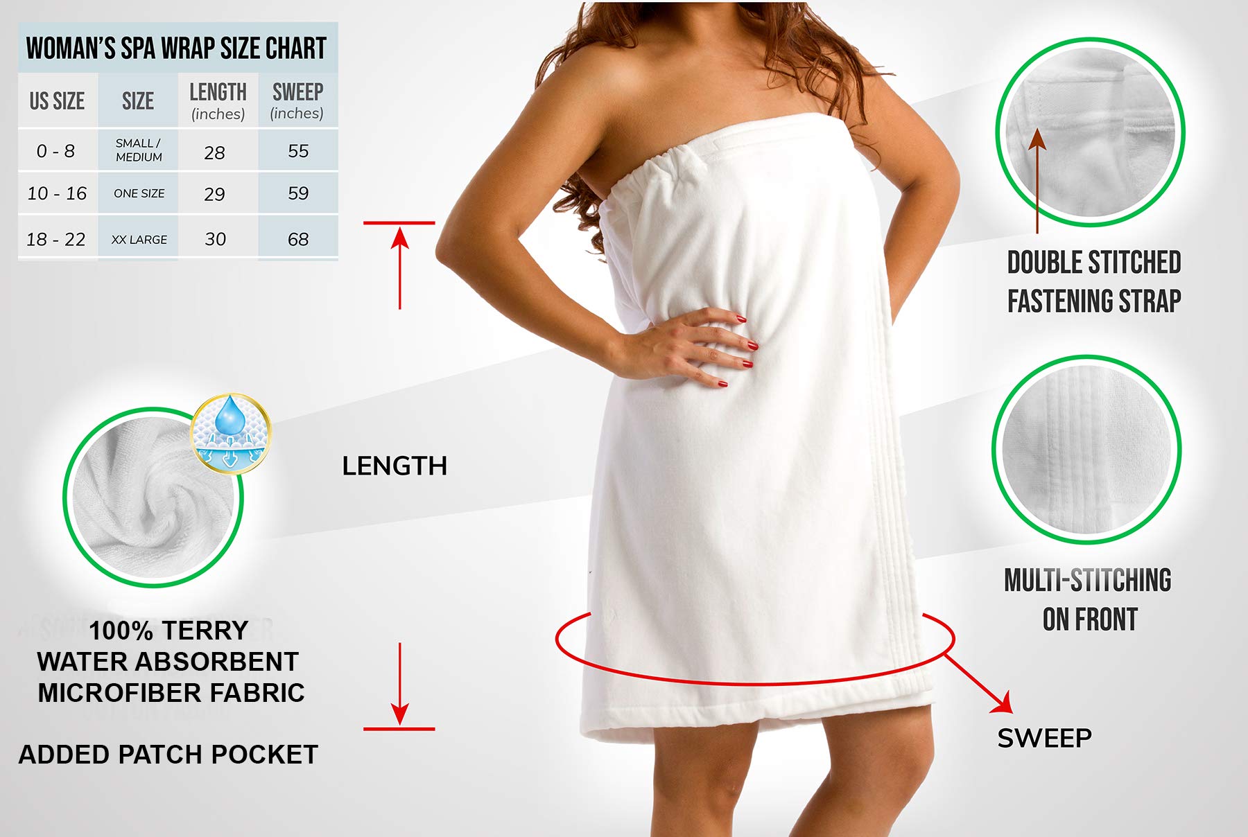 • FEATURES: Microfiber spa wrap towels with hook and loop fastener closure for women. Added patch pocket and adjustable elastic band for convenience