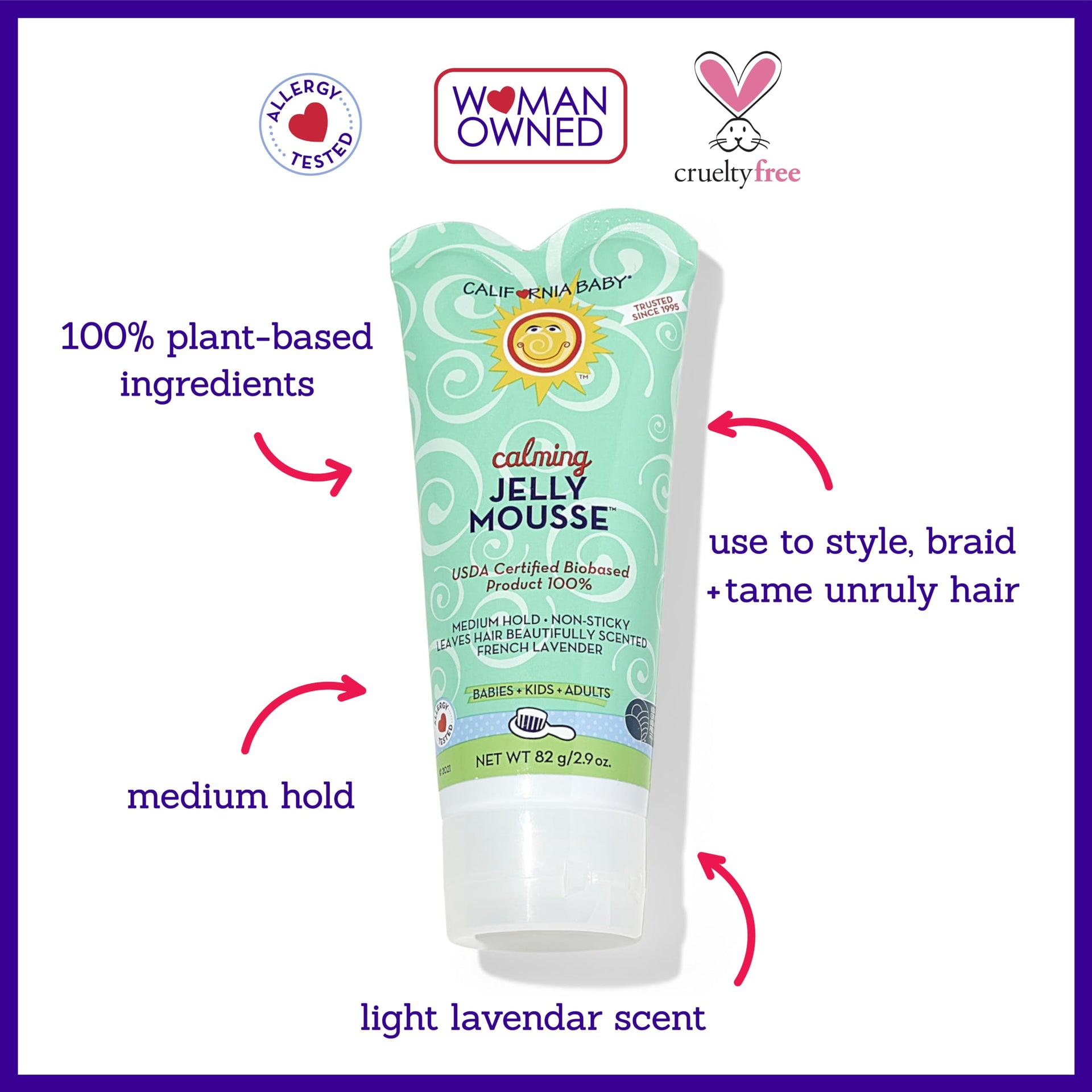 • SAFE, 100% PLANT-BASED KIDS HAIR GEL: No harsh chemicals - California Baby Jelly Mousse is an infant safe hair gel, made with 100% plant-based ingredients. Our baby hair gel for infants is free of harsh, drying chemicals like alcohol, PEGs, and glycols.