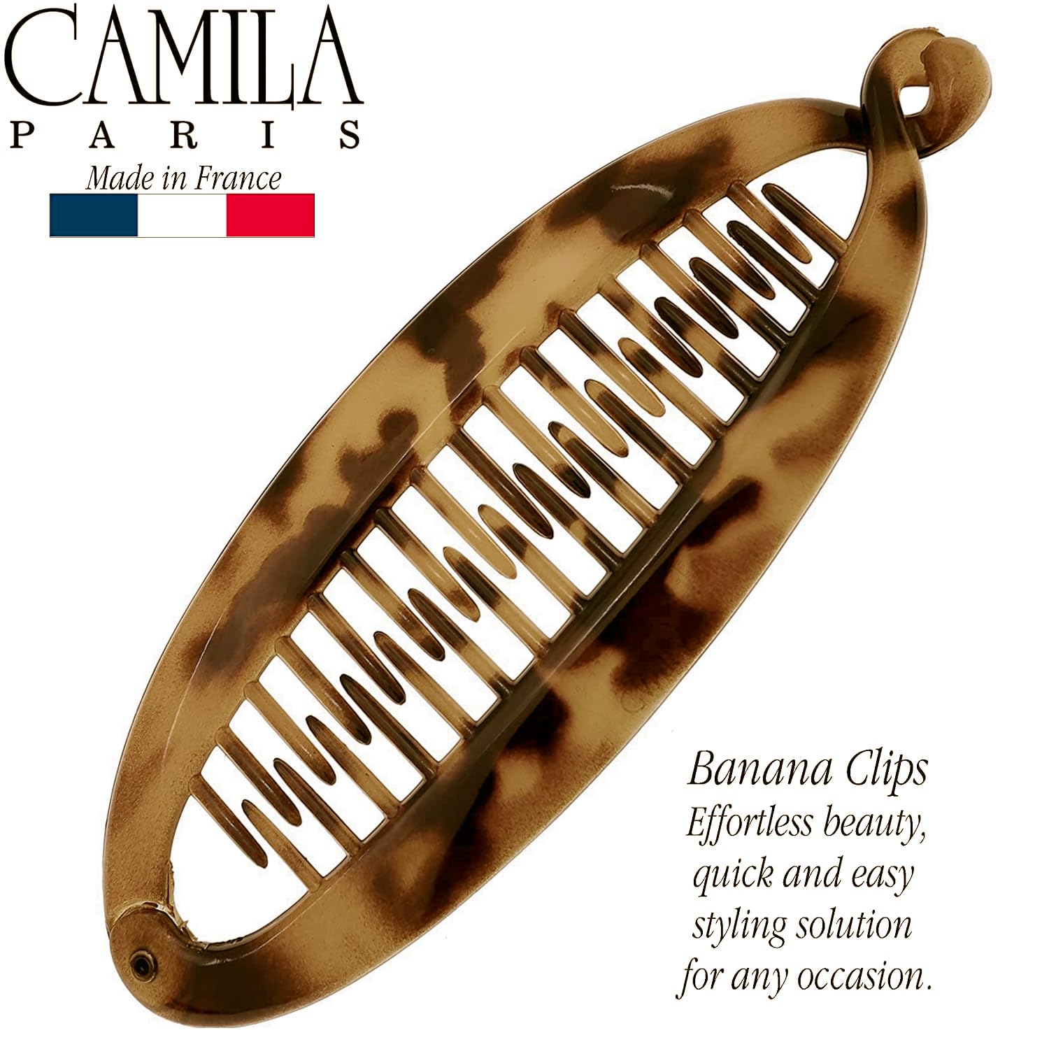 Camila Paris CP1272 Size 4.5 Inch French Hair Accessories, Hair Banana interlocking combs. Strong Hold No Slip Grip for Women and Durable Styling Girls Hair Ornaments. Made in France with Cellulose Acetate. With its beautiful and timeless designs featuring styles as hair barrettes, hair clips, ponytail holders, hair bananas, headbands, Hair pins, and more, decorated with unique designs, prints, and patterns. Handmade pieces are ideal for special occasions and include a large selection of hair ornaments for everyday use. We count with innovative features such as French Grip System ideal for fine hair, Spring Cover no visible hinge, Grip Link hinge replaced for a durable rubber band that holds better and maintain the due hair for all day. Camila Paris collection are for all hair types, fashion hair tools for Tokyo brown dark light brunette blondes red heads; use for adults with curly wavy straight frizzy fine thin long medium mid back shoulder length hairstyle; cutting curling coloring drying or straightening. Camila Paris 20 years of professional experience and products knowledge, a high quality hair ornaments line. A staple of excellence in the hair accesories industry