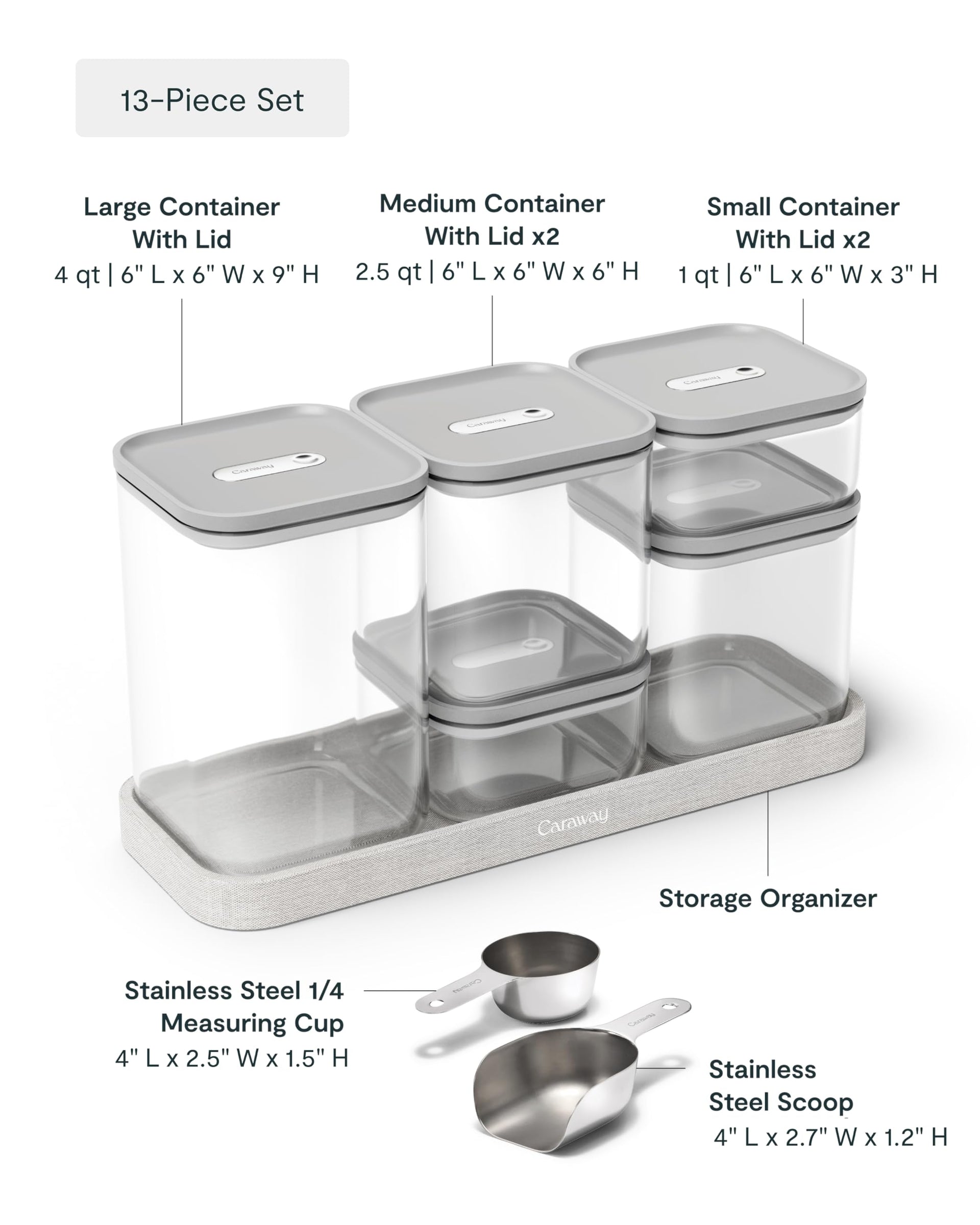 Keep your ingredients fresh, organized, and easily accessible with Caraway’s 14-Piece Glass Airtight Food Storage Container Set. Designed for modern kitchens, this set includes five durable glass containers in multiple sizes, each fitted with a True Airtight Seal to preserve flavor and block out moisture, air, and pests. Whether you’re storing flour, pasta, coffee, or seeds, these airtight food storage containers are built for functionality and style. Crafted from non-toxic glass free from BPA, BPS, PFOA, and PFAS, each airtight container resists scratches, stains, and lingering odors. The set is dishwasher-safe (glass components) and easy to maintain, making it ideal for everyday use. The modular, stackable design saves space and looks beautiful in any setup-from countertops to cabinets-making it your go-to air tight pantry storage containers solution. Perfect for kitchen storage containers airtight needs, the set also includes a stainless steel scoop, a ¼ measuring cup, a storage base, and a magnetic organizer. Whether you're upgrading your kitchen storage containers or building your dream pantry, this air tight storage containers system is the all-in-one answer. Use them as food storage containers for pantry, air tight containers for food, or to simplify your dry goods storage-Caraway’s quality brings peace of mind to every pour, scoop, and refill.