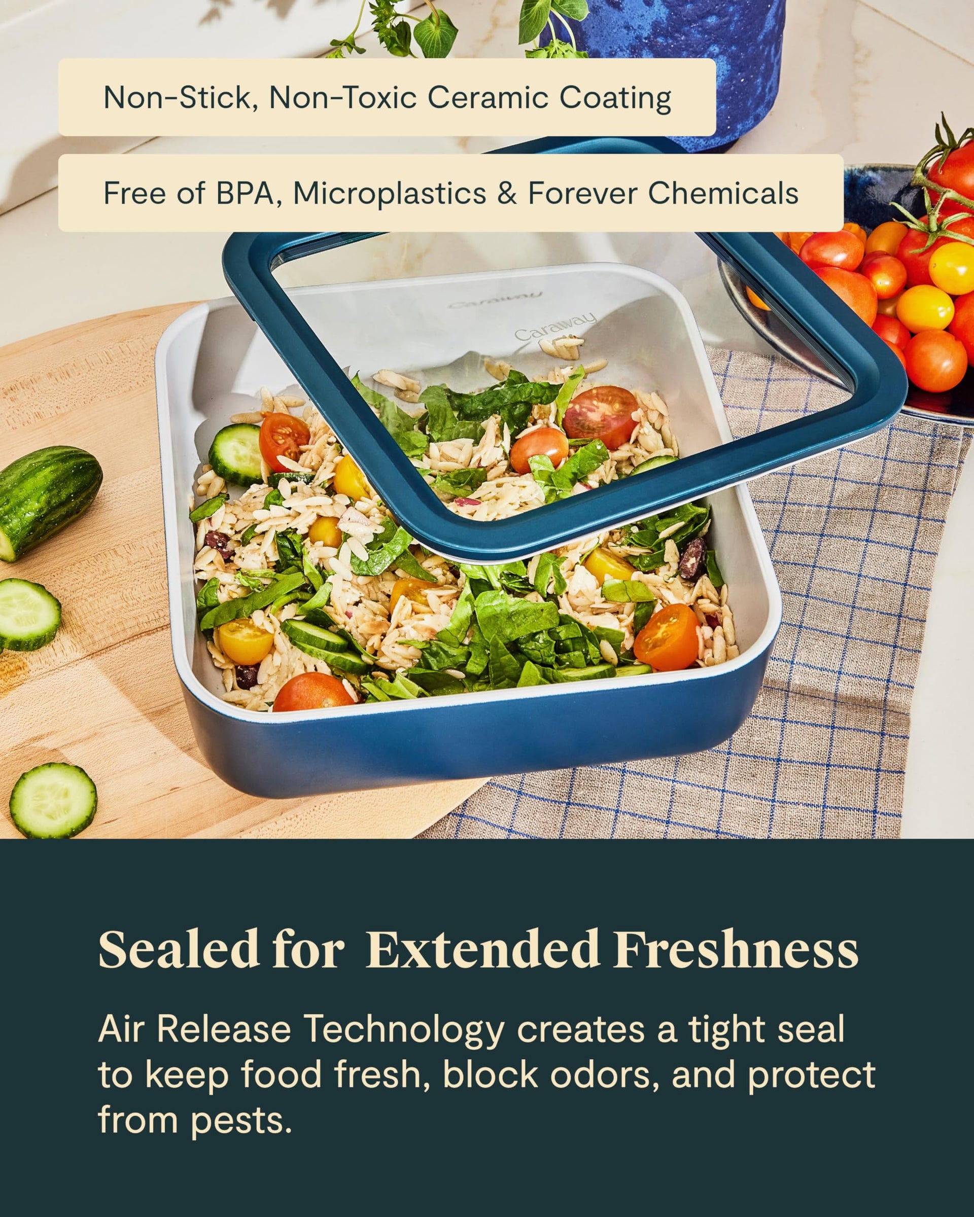 Introducing Caraway’s food storage with lids. Each 10 cup food container is made with non-toxic ceramic coated glass that is guaranteed to keep your leftovers fresh and organized. Our containers are the perfect size for meal prepping. The included Dot & Dash Containers allows you to create easy on-the-go bento boxes for your next lunch. You can use the inserts for sides, dips, sauces, and more. They pack neatly into one of the large food containers and can be tightly sealed with the glass lids and container straps. Each glass food storage comes in modern colors such as: Gray, Cream, Sage, Mist, Navy, and Perracotta. They go perfectly with the rest of your Caraway collection and fit into any kitchen aesthetic.