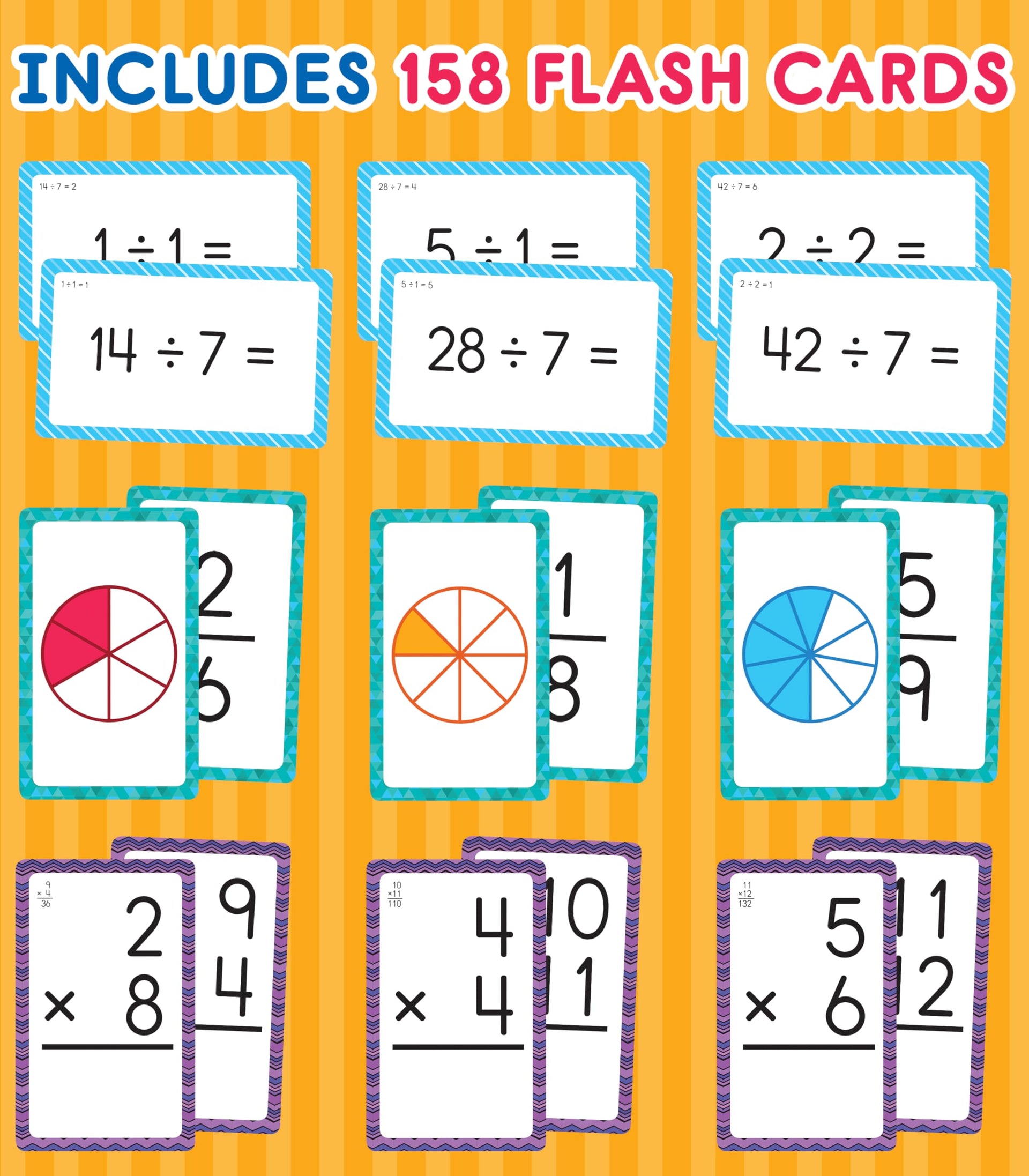 - Fractions, Multiplication and Division Flash Cards: Practice and reinforce essential math facts for school success in a fun and engaging way using Carson Dellosa’s 3-Pack of Math Flash Cards!