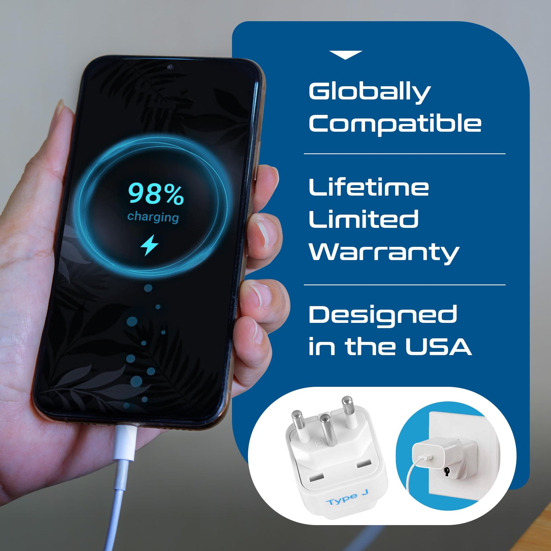 Ceptics Switzerland Travel Plug Adapter (Type J) - 3 Pack [Grounded & Universal] (GP-11A-3PK)