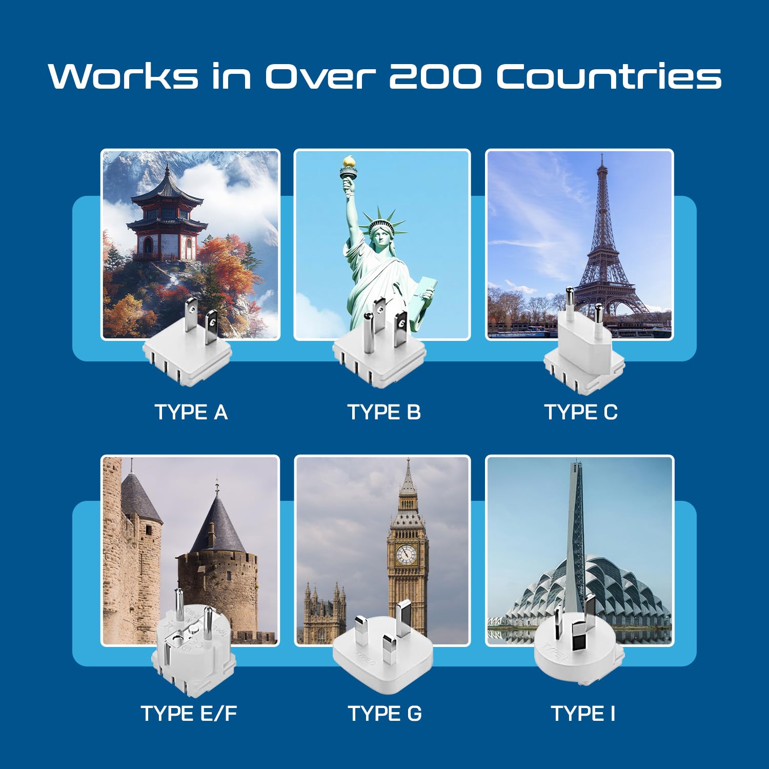 Ceptics Universal Travel Adapter Kit – 2 USA Sockets, USB-A, USB-C PD 35W + Cable, Surge Protected Plugs for EU, UK, AU, China, Japan, ETL Tested