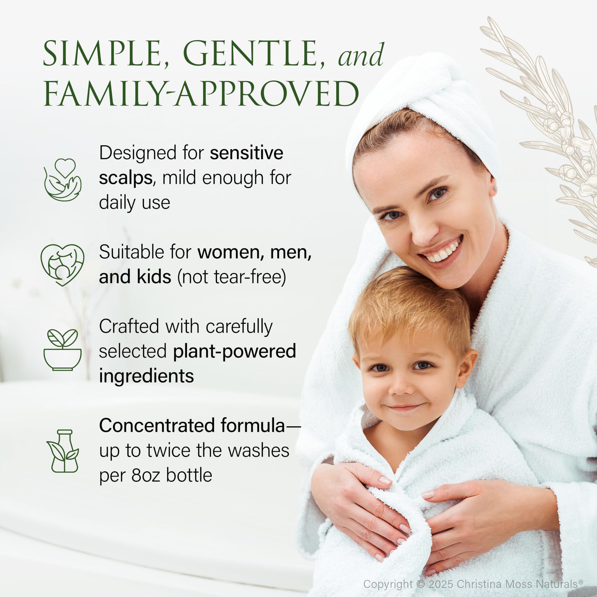 • Directions: Apply a small amount of shampoo to wet hair and massage into a rich lather, focusing on the scalp; rinse thoroughly and for best results, follow with Christina Moss Naturals Original Conditioner.