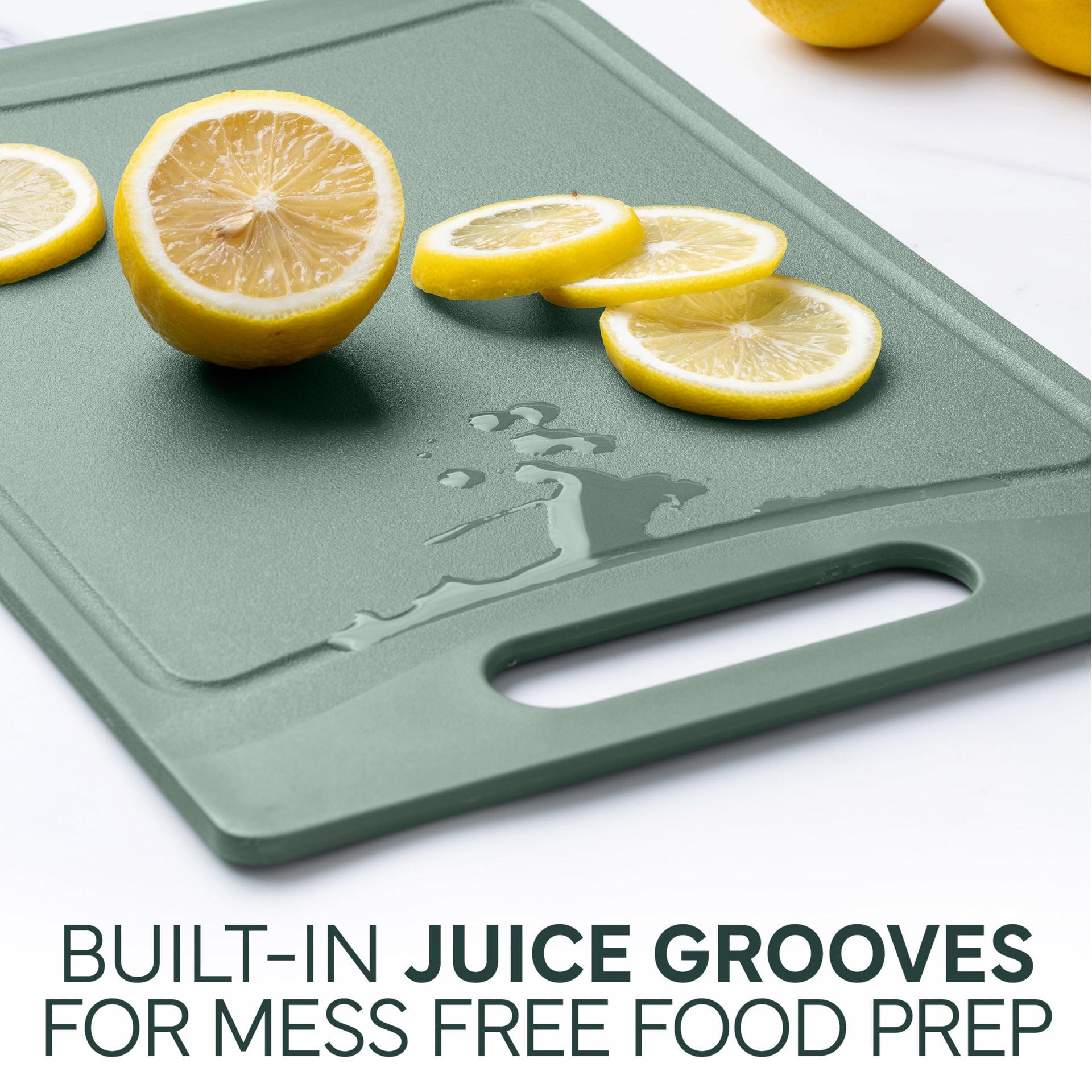 • SAFE AND NON SLIP - Our food grade BPA free chopping boards for meat, fish, vegetables and more, feature rubber feet so you can be worry free while cutting your favorite foods. The hard plastic surface will keep your knives sharp.