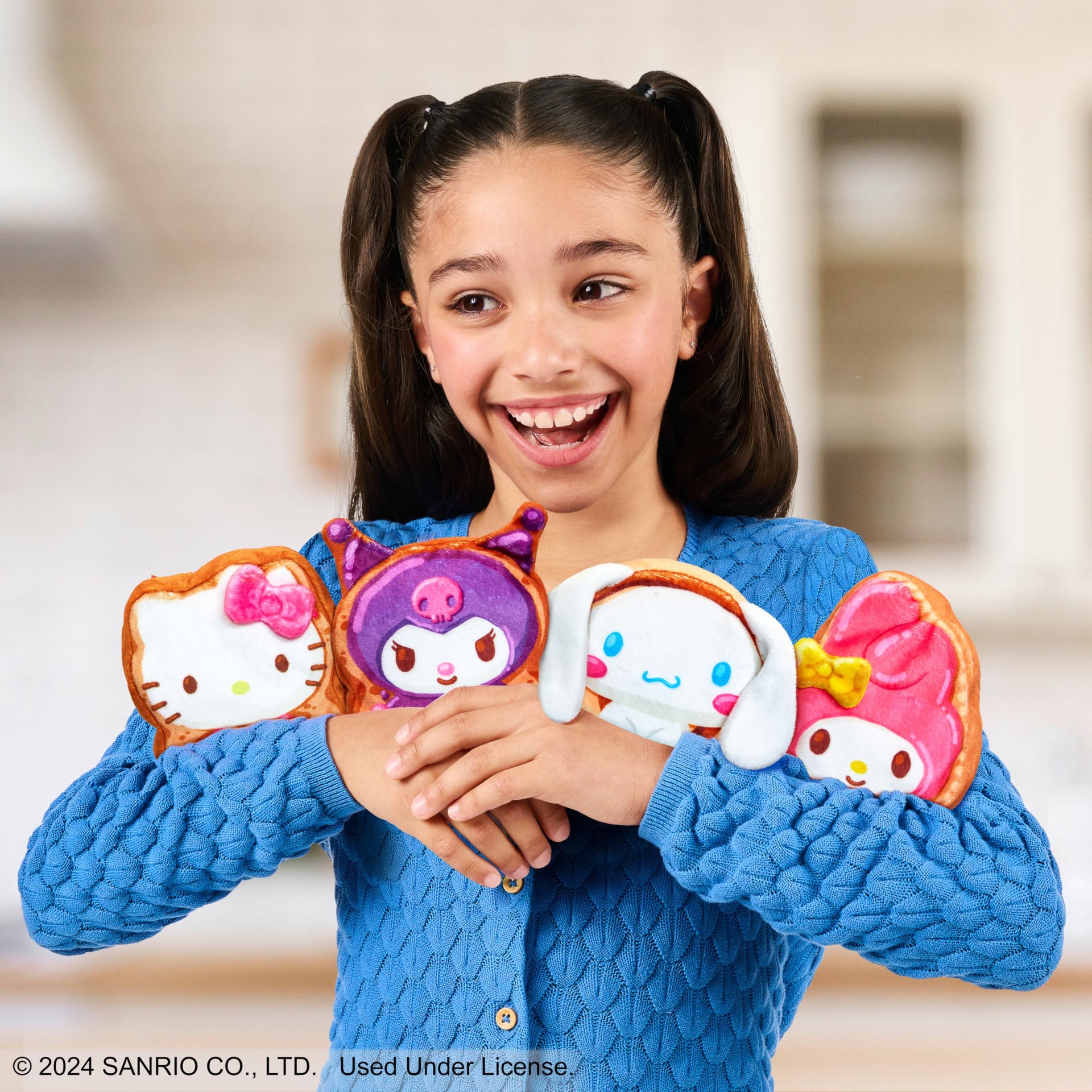 Which surprise plush friend will pop up out of the Cookeez Makery Hello Kitty® and Friends Toasty Treatz Toaster? Your child won't believe the sweet-scented treat they're about to meet. First, pop the bread into the toaster slot, then slide the toy toaster's handle down. Now slide the handle back up to reveal the cutest Hello Kitty and Friends Toasty Treatz surprise plush! Toasty Treatz are soft, squishy, and deliciously scented collectible plush in the shape of Hello Kitty® and Friends and adorable breakfast treats. Which one will pop up? Will your child find Hello Kitty, Cinnamoroll, My Melody, Keroppi, Kuromi, or Pompompurin? There are 6 scented Hello Kitty and Friends Toasty Treatz for kids to collect. Toasty Treatz can't wait to pop up and spread their scented love and squishy hugs.