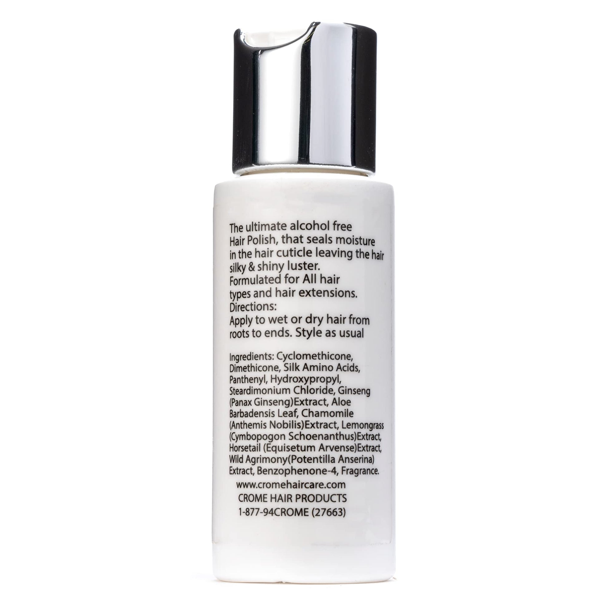 Crome: Liquid Crome - Anti-Frizz Hair Serum (2 oz) Lightweight, healthy, easy-to-use, and full of nourishing natural ingredients that repair your hair with daily use. Our serums give you the shine and glossy brilliance you want while keeping your hair healthy and glowing. Get the most from your hair care with Crome! Pamper Your Hair Liquid Crome does more than make your hair look good, it acts as a moisturizer sealing hydration into your scalp down to the cuticle level for healthy full hair growth. Liquid Chrome does more than a normal polisher, this serum protects hair from heat and UV damage by acting as a sunscreen. No more fading, no more dried-out damaged hair, and no more frizzy mess! Liquid Crome keeps your hair smooth and shiny no matter how hot and humid it is outside. The heat protection also enables you to style your hair however your like. Styling has never been easier, you can blow dry, flat iron, curl, and more without worrying about harming your hair. Simple Daily Use Liquid Crome is easy to use, just pour some into your hands and emulsify it then distribute it evenly through your hair from roots to ends. Liquid Crome is a lightweight serum for women and men that's alcohol- , oil- , and cruelty- . It works for all hair types and can be applied to wet or dry hair. Liquid Crome is also available as a spray on serum. Try combining with Crome Hair Food for easy flat ironing. Crome Hair Care Products Crome does more than create hair care solutions. Our products are designed to the highest professional standards to nourish, repair, and care for your hair with daily use. We make products that improve the health of your hair with daily use. The best hair starts with the best products, so each of our hair care solutions is made to make your hair look as good tomorrow as it does today. Get the best for your hair and get the best from your hair with Crome.