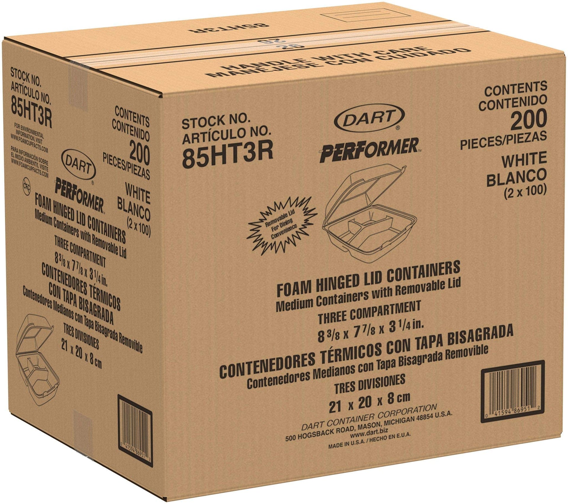 DART 85HT3R Med Perforated 3 Comp Foam Hinged Container, 8.5 Inches (Case of 200), original version,White