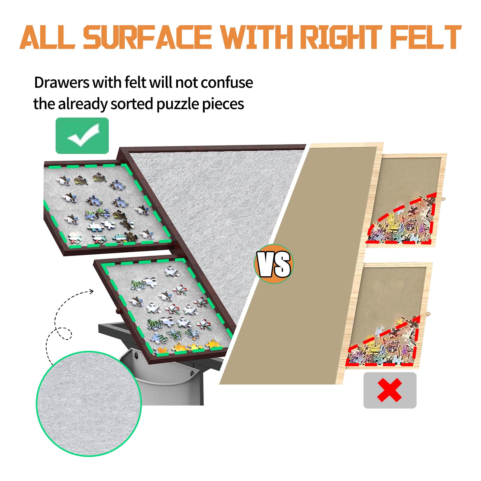- Jigsaw Puzzle Table with Drawers:4 sliding drawers of the adjustable height puzzle tables were also fitted with felt,and the sides of the drawers were fitted with metal sheet to prevent jigsaw pieces from falling off and ensure all the drawers are stay closed when transportation.