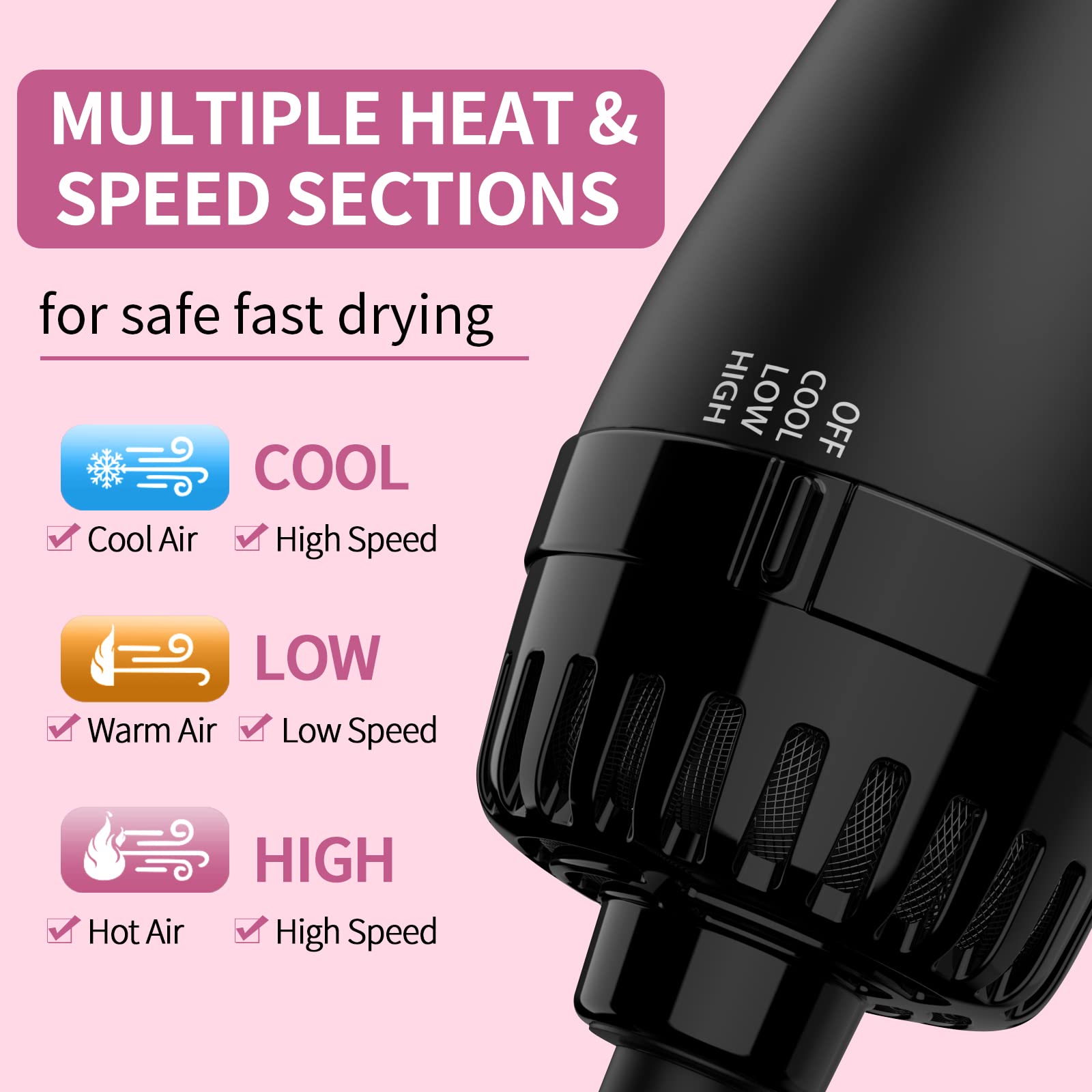 - 3 Settings for Styling Flexibility: 3 Heat/Speed Settings with Cool option for styling flexibility and great results on different hair types. The 1200W powerful motor provides the right heat to efficiently dry wet hair without causing any damage to hair