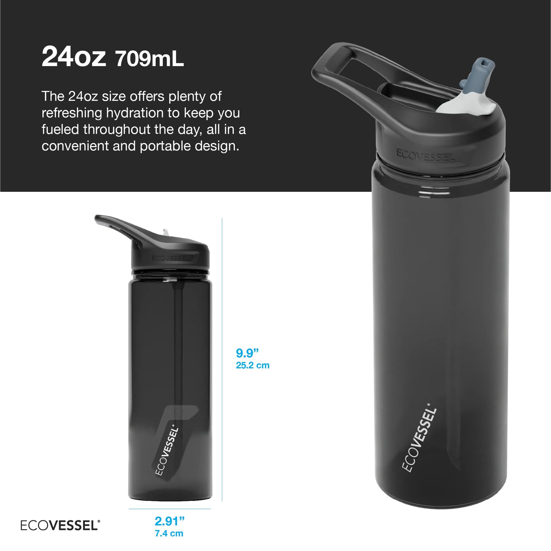 Wave Tritan, BPA-Free Water Bottle (24 oz) The WAVE Tritan sports water bottle is the smart choice when you want a lightweight bottle without giving up quality and durability. You'll appreciate the comfort and convenience of one handed, tilt-free drinking when hydrating on the go. The detachable silicone straw makes cleaning the sports water bottle easier, too. With multiple different colors to choose from and the quality you've come to expect from EcoVessel, this sports water bottle is sure to be the perfect new accessory for your everyday activities. Features of Wave Water Bottle: Made with Eastman Tritan BPA Free Plastic Durable, lightweight, long-lasting Free of BPA, BPS, and phthalates Lightweight, durable, reusable Will fit most cup holders Convenient, comfortable flip spout Soft touch carrying handle Tilt free drinking Easy to clean with detachable silicone straw When not using, make sure the spout is all the way down to avoid leaking. We do not recommend tossing the bottle into a bag, in case the spout accidentally opens. Use caution when using near electronics and items of value. If lids are not properly secured, there is a potential to leak.