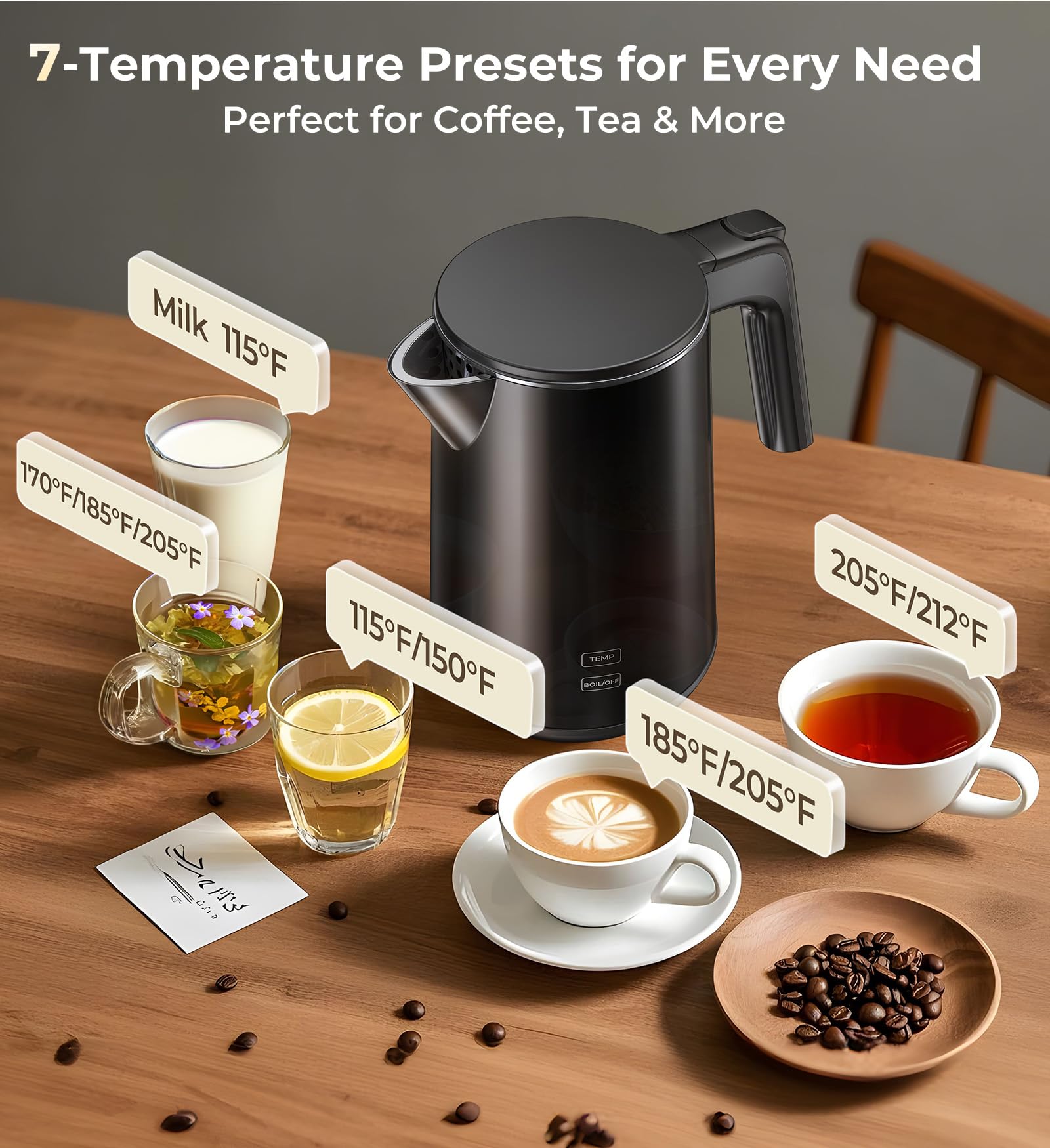 • 【Versatile Electric Kettle with Precision Control】 This electric tea kettle features 7 temperature settings(115°F-212°F), ensuring perfect brewing for green tea, coffee, or oatmeal. The rapid-boil technology heats water faster than standard kettles, while the auto-shutoff function enhances safety during use