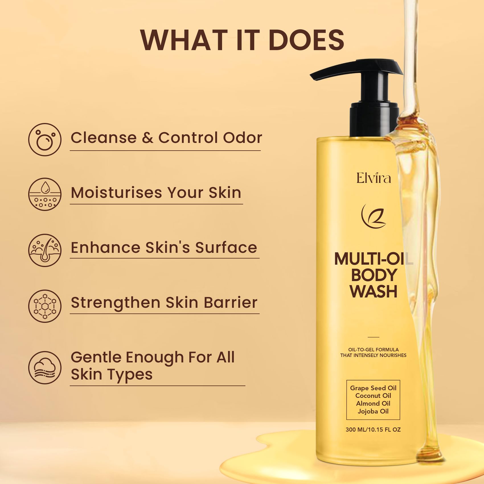 - DEEPLY HYDRATING: Treat yourself to our Multi-Oil Body Wash, infused with 16 nourishing essential oils and glycerin. This hydrating formula transforms from a silky oil into a rich, gentle lather, cleansing your skin without stripping it of essential moisture