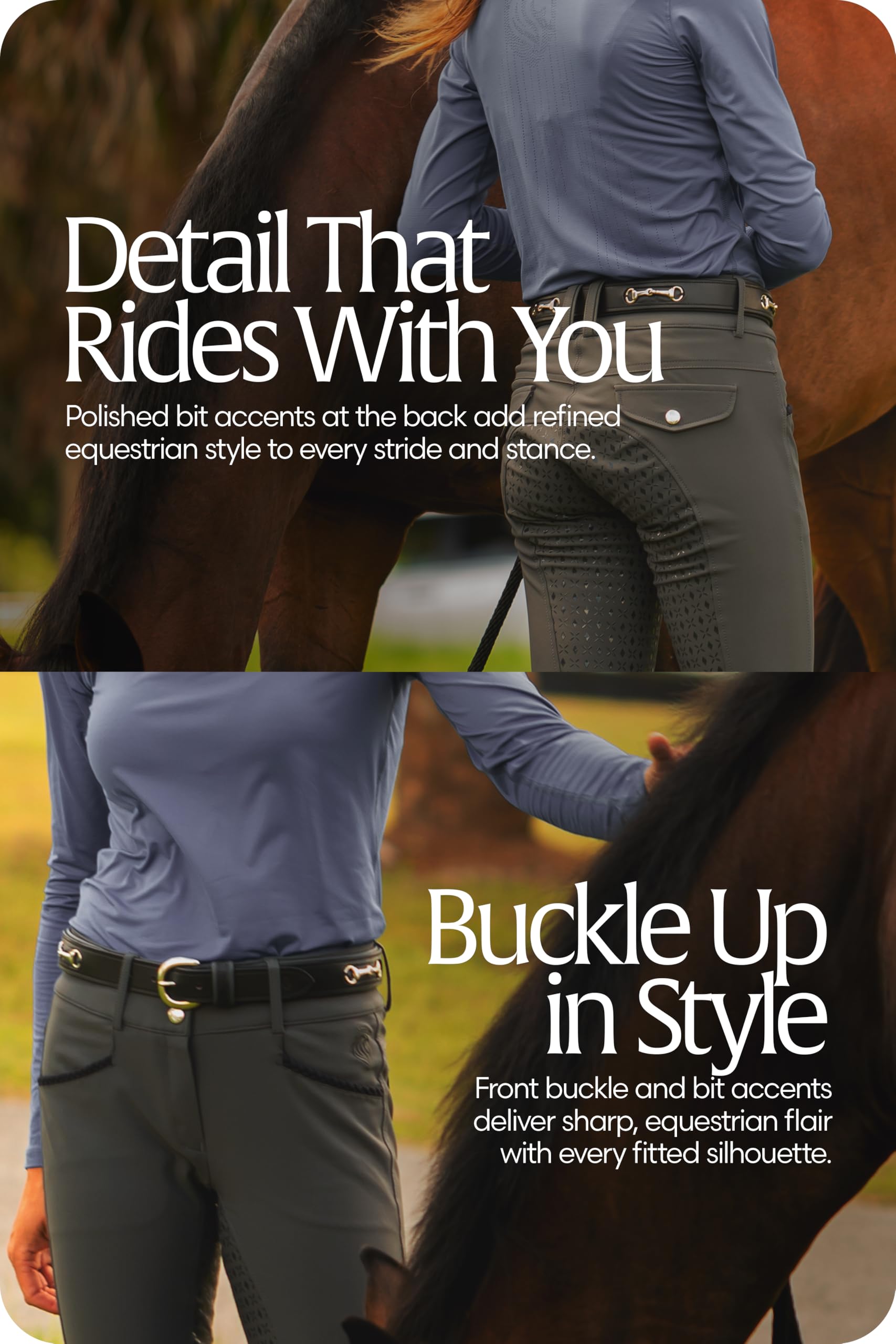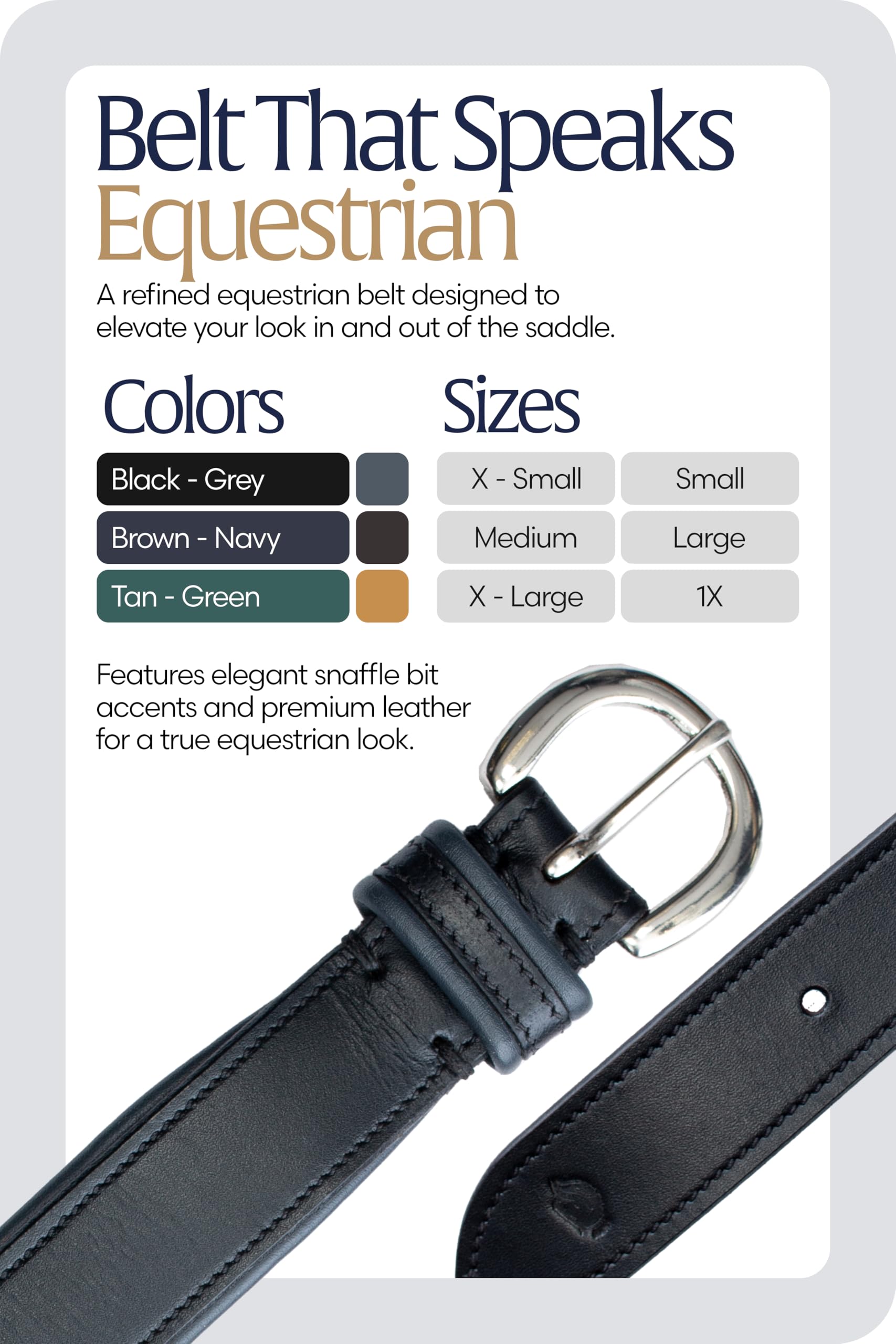 The Equinavia Tirild Bit Belt is a great addition to any equestrian's closet! This belt features a soft leather padding with a contrasting full grain overlay. Snaffle bits spaced evenly along the belt are stitched into cutouts, revealing the contrasting color beneath. Its horseshoe-shaped buckle complements the equestrian-inspired design. With a width of 1 1/8 inches and five buckle holes, it ensures a tailored fit. Available in Black, Hunter Green, or Navy Blue, each with unique hardware and padding options.