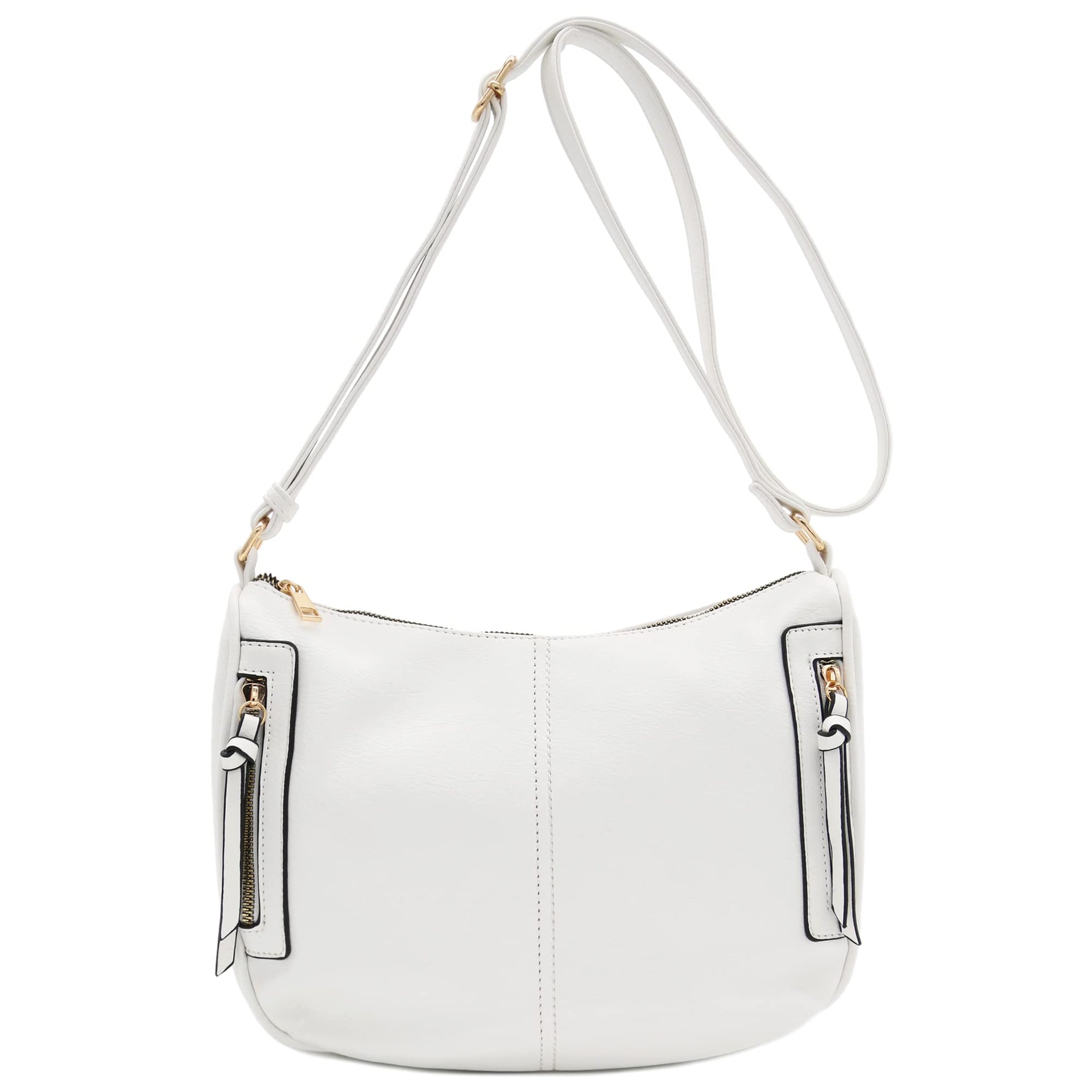 FashionPuzzle Faux Leather Two Front Zipper Pocket Crossbody Saddle Bag (White)