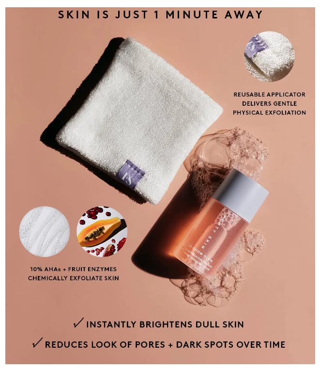 This 10% AHA (Alpha Hydroxy Acid) treatment clarifies, purifies and smooths skin by gently clearing out dull cells on the surface and going deep into pores to smooth, refine, brighten and even texture over time. Photo-ready skin in just 1 minute Concentrated cocktail of AHAs, Rooibos, and fruit enzymes and extracts loosens and lifts dead skin cells and dulling buildup Unique reusable applicator delivers gentle physical exfoliation Antioxidant-packed formula leaves skin ultra-soft, radiant and makeup-ready Infused with a light, fruity-floral scent inspired by Pomegranate and Hibiscus HOW TO USE: Wet reusable applicator and your face with water (we love to use it in the shower!). Pour a dime-sized amount of solution into the center of the wet applicator. Gently scrub face with the applicator for 30-60 seconds, working the solution into a plush lather. Rinse, pat dry, then follow with toner. If using during the day, make sure to follow up with Hydra Vizor to protect your skin from the sun as AHAs can increase UV sensitivity. If using at night, make sure to remove your makeup beforehand with Total Cleans’r, and then follow up with Instant Reset after use. For best results, use Pre-Show Glow twice a week on non-consecutive days with the applicator. Sensitive skin? May want to start by applying with fingers or using once a week. INGREDIENTS: AQUA/WATER/EAU, GLYCOLIC ACID, SODIUM C14-16 OLEFIN SULFONATE, BUTYLENE GLYCOL, COCAMIDOPROPYL BETAINE, POLYGLYCERYL-10 LAURATE, GLYCERIN, POTASSIUM HYDROXIDE, LACTIC ACID, LACTOBACILLUS/PUNICA GRANATUM FRUIT FERMENT EXTRACT, VACCINIUM MACROCARPON (CRANBERRY) FRUIT EXTRACT, MALPIGHIA PUNICIFOLIA (ACEROLA) FRUIT EXTRACT, ASPALATHUS LINEARIS LEAF EXTRACT, HIBISCUS SABDARIFFA FLOWER EXTRACT, PAPAIN, PANTHENOL, CITRIC ACID, LEUCONOSTOC/RADISH ROOT FERMENT FILTRATE, CYANOCOBALAMIN, SODIUM BENZOTRIAZOLYL BUTYLPHENOL SULFONATE, SODIUM CHLORIDE, SODIUM HYDROXIDE, PARFUM/FRAGRANCE, CAPRYLYL GLYCOL, PHENOXYETHANOL.
