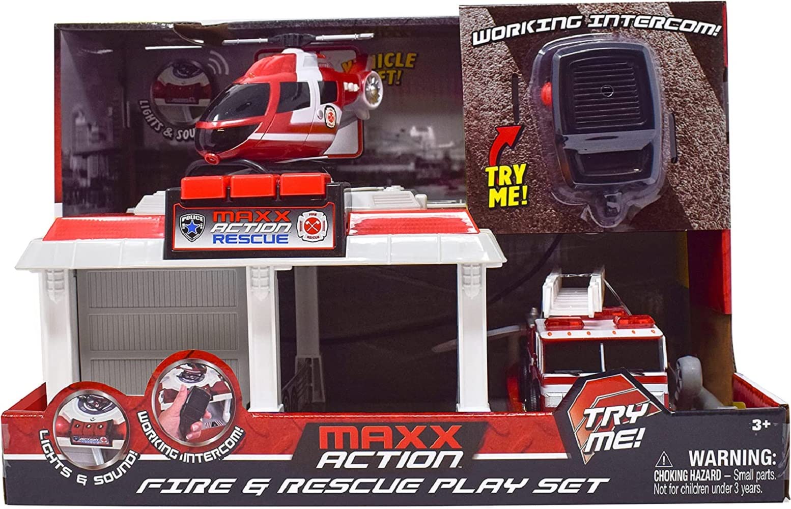 Fire & Rescue Garage Toy Set with Lights & Sounds – Parking Garage, Vehicle Lift, Intercom, Helicopter & Fire Truck with Friction Motor for Kids