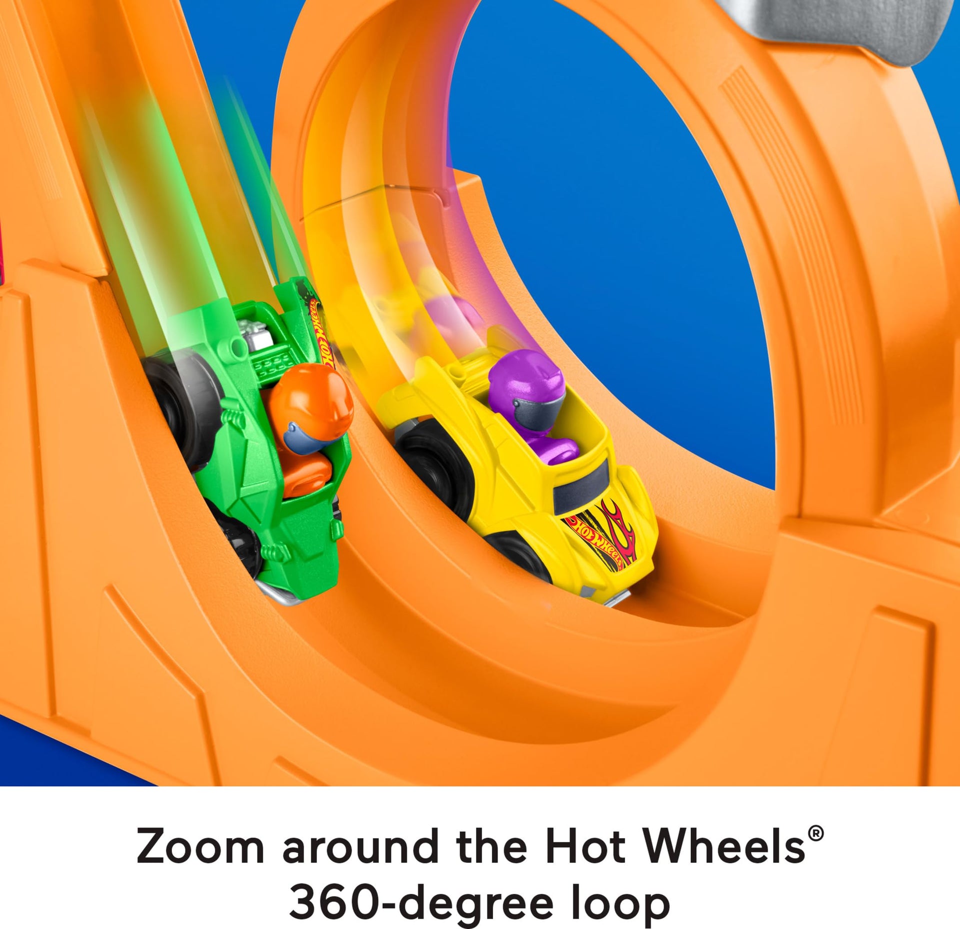 • Toddler playset with Hot Wheels inspired Wheelies & 4 different tracks: Spiral launcher, Hot Wheels 360-degree loop, ring of “fire” jump & off-roading