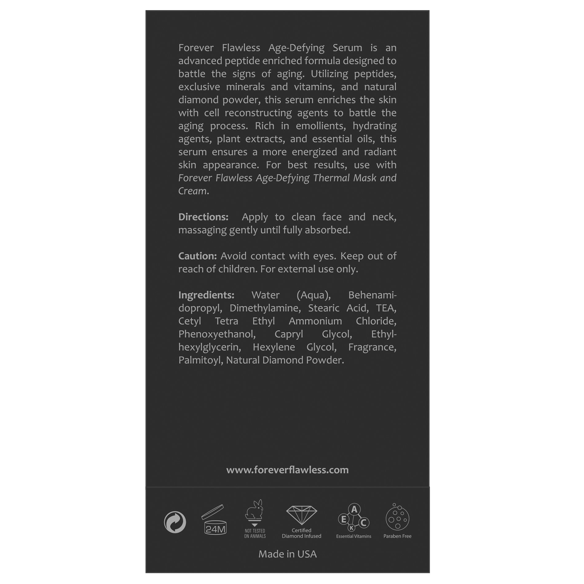 • MADE IN THE USA - Forever Flawless products are proudly made in the United States. We make high-end skin care products that offer salon-quality results. The Diamond Infused Age-Defying Serum is part of our Black Diamond line of products. These anti-aging treatments offer a safe and natural alternative to a face lift, and they can be used in the comfort of your own home.