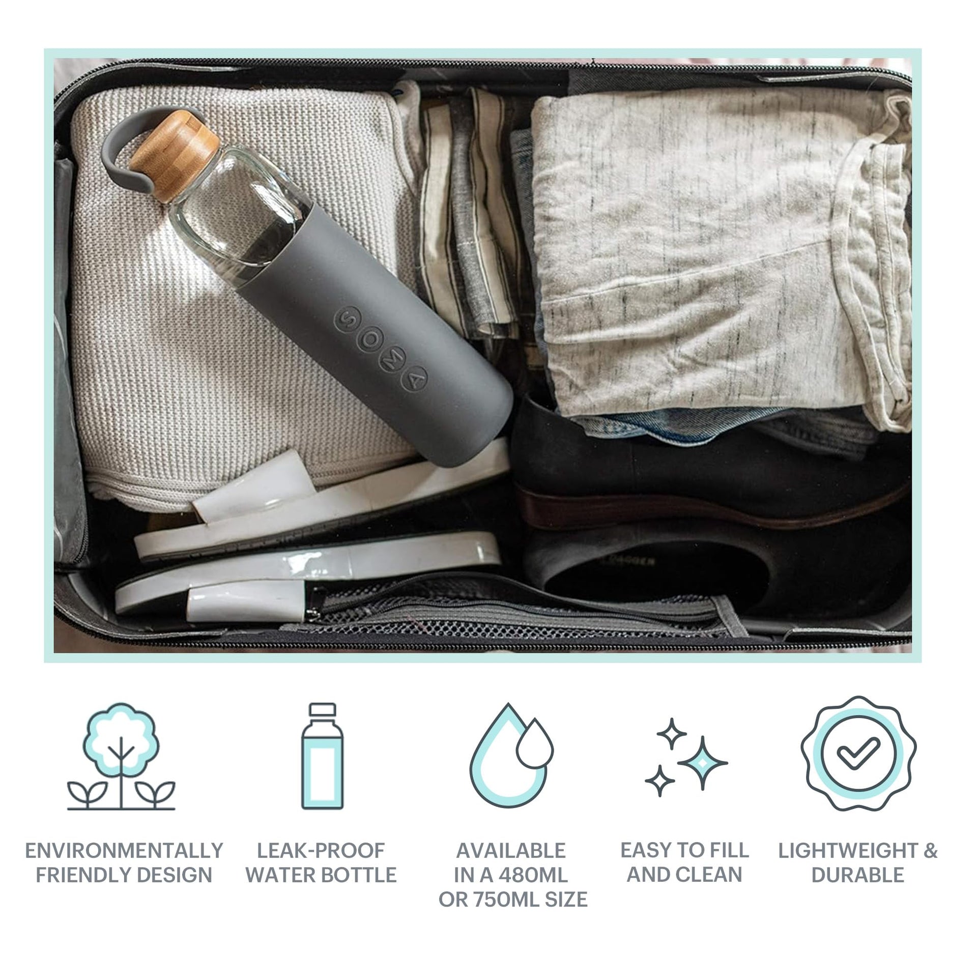The Soma Water Bottle is made from 100% BPA free borosilicate glass. Not only is this material completely free of harmful chemicals that could leach into your drinking water, It’s also completely shatter-resistant. It’s durable and built to last, even if you drop it. The cap is made from sustainably sourced bamboo, and it comes with a soft silicone sleeve, so you can grip It easily. The mouthpiece was even designed for maximum ergonomic comfort while drinking. The size was very carefully considered. We wanted to make it small and lightweight enough to fit everywhere you need it to be, While still carrying enough water to keep you hydrated. It fits perfectly into a handbag or a gym bag, and even neatly slots into your car’s cup holder.