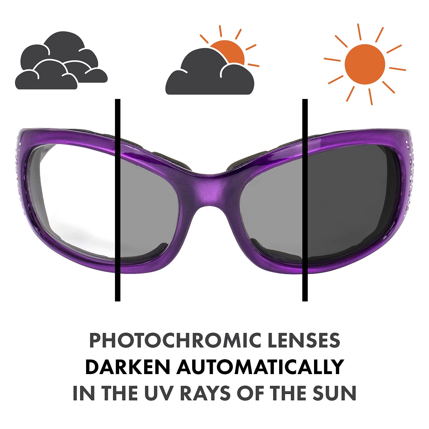 Size:One Size The Global Vision Eyewear Marilyn 2 series photochromomatic eyewear provides optimal sight regardless of the time of day. Photo chromatic lenses block harmful ultraviolet rays during the day and then adjust to the evening's fading light. The product features are shatterproof polycarbonate lenses, UV400 filter for maximum UV protection, scratch resistant coating, lenses that transforms from a clear to smoke and designed with 20 crystal rhinestones and 24 metal studs.