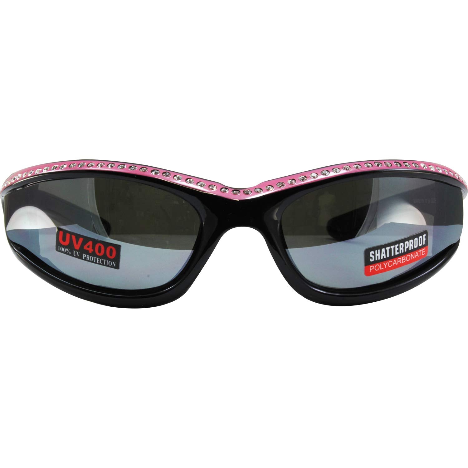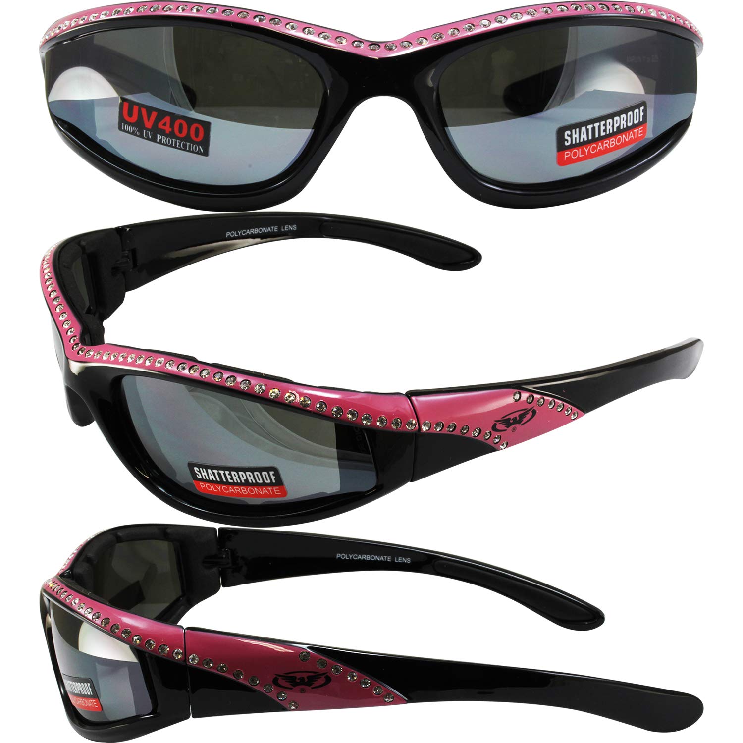 Shine a light on a fierce and feminine style worthy of that one-named diva we all love and admire. When you wear a pair of Global Vision Marilyn 11 Women's Padded Motorcycle Sunglasses with Flash Mirror Lenses, you'll ride in a style that is as glamorous as it is tough, just like Marilyn herself. These sporty shades feature black frames emblazoned with a curved stripe outlined in 86 crystal rhinestones that sparkle and shine in the light. The Marilyn 11 also features shatterproof polycarbonate lenses with a UV400 filter for maximum UV protection as well as vented EVA foam padding for the ultimate in comfort on your long rides. The comfortable padding also allows for natural ventilation as well as protection from wind and debris. The scratch-resistant coating on these lenses stand up to the wear and tear of daily use and abuse. Ride away in the style becoming a stylish and fierce lady like Marilyn, or yourself. This combination features 1 pair of black frames with a pink curved stripe and 1 pair of black frames with a red curved stripe, both outlined in 86 crystal rhinestones designed to dazzle and delight. Both pairs boast flash mirror lenses.