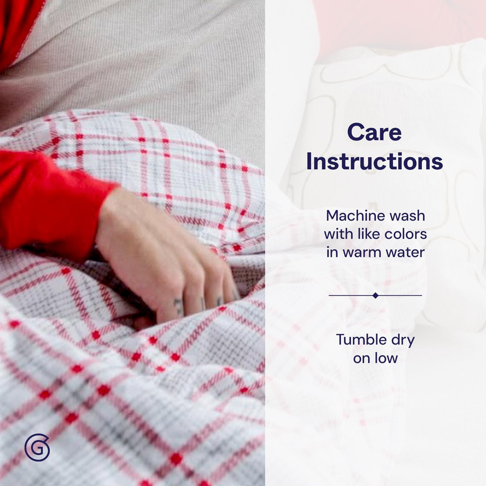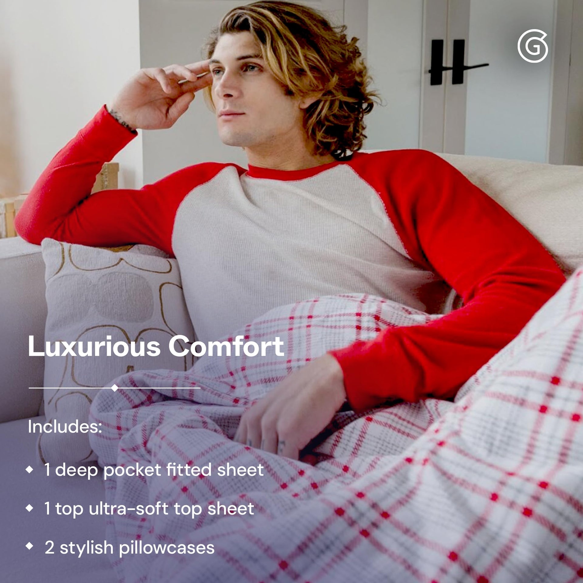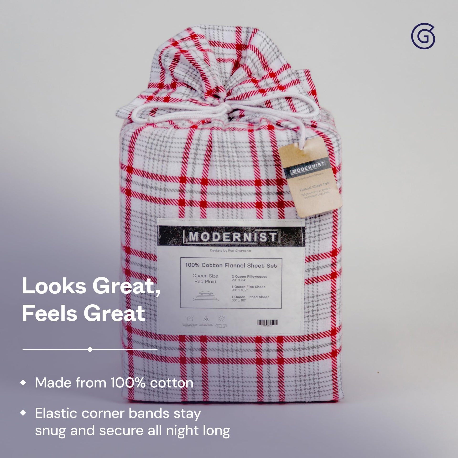 Gravity Modernist Flannel Bed Sheet Set, King (Red Plaid) - 100% Cotton Plaid Bedsheets - Includes Deep Pocket Fitted Sheet, Top Sheet & Pillowcases -
