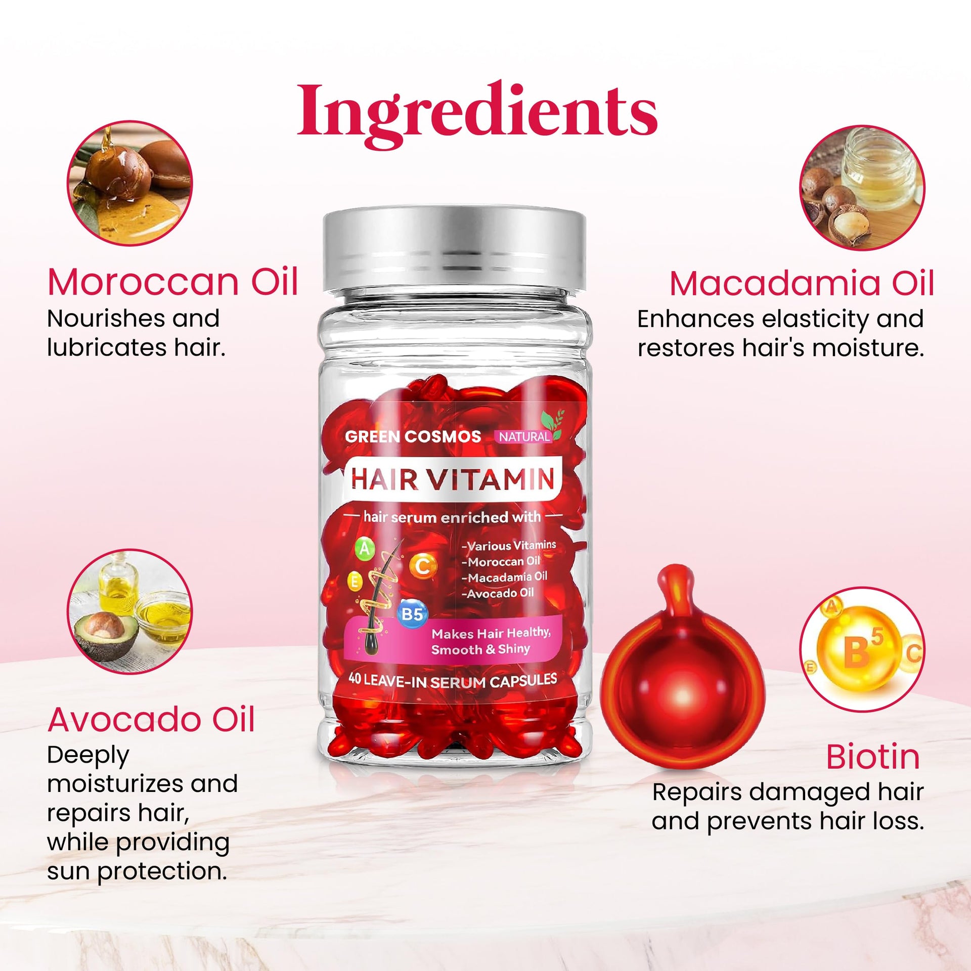 • 🌟 Intensive Hair Vitamin Treatment: Green Cosmos Hair Vitamin Treatment & Moisturizing Oil Capsules are formulated with Avocado, Macadamia, and Moroccan Oil to nourish and repair dry and damaged hair.