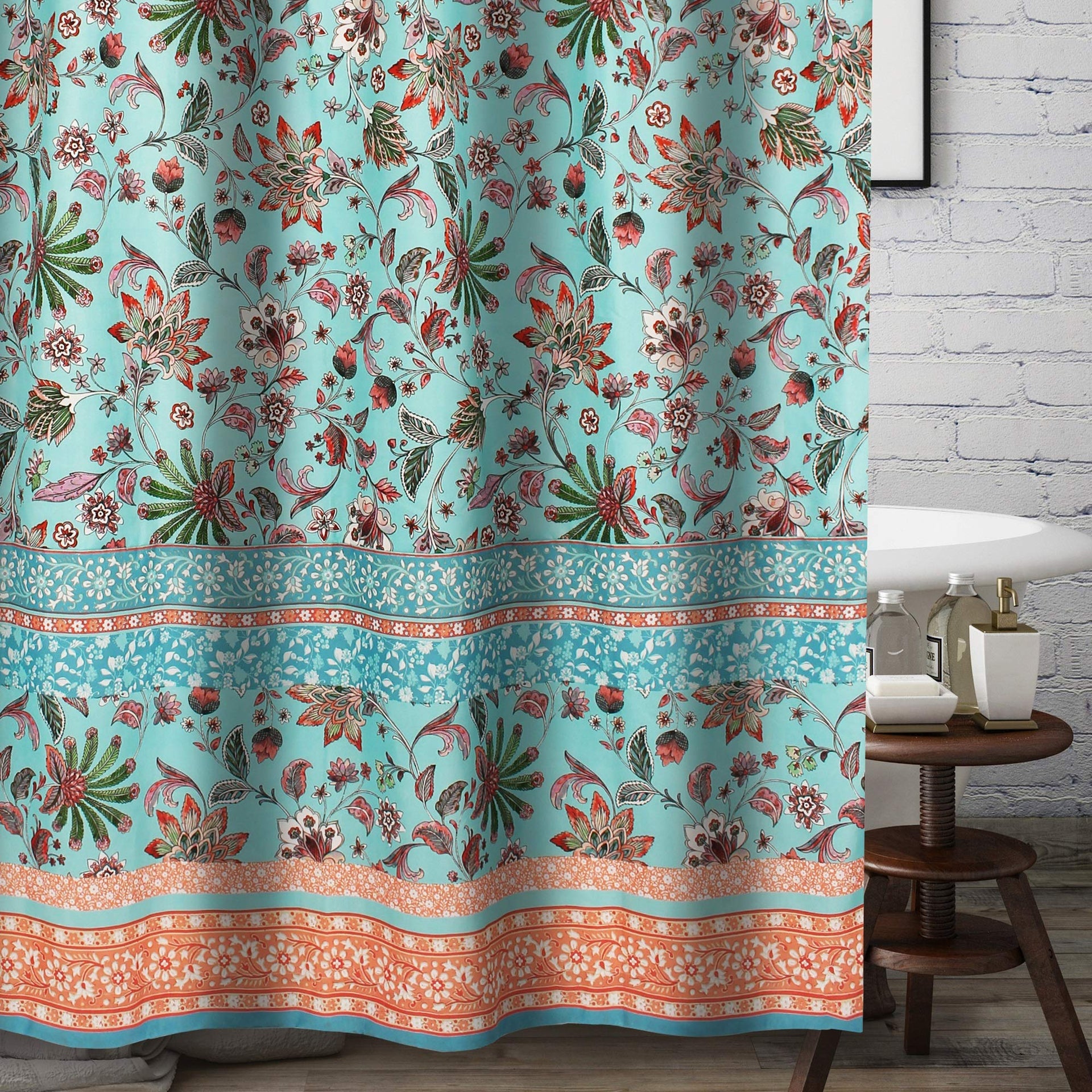 Add a chic boho vibe to your space with the Audrey shower curtain. Featuring stylized jacobean fern and floral prints in turquoise and coral tones for an exotic, tropical look and feel, this shower curtain provides an oasis of privacy. Reinforced button holes along the top for easy hanging. Hanging hardware not included. Dimensions: 72x72 inches. Designed for use with a waterproof liner [not included]. 100% polyester microfiber. Machine washable.